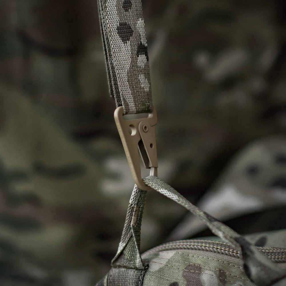 Лямка крепится к баулу металлическим карабином, регулируется по длине пряжкой Sliplock от Woojin и, при необходимости, может выполнять функцию оружейного ремня.