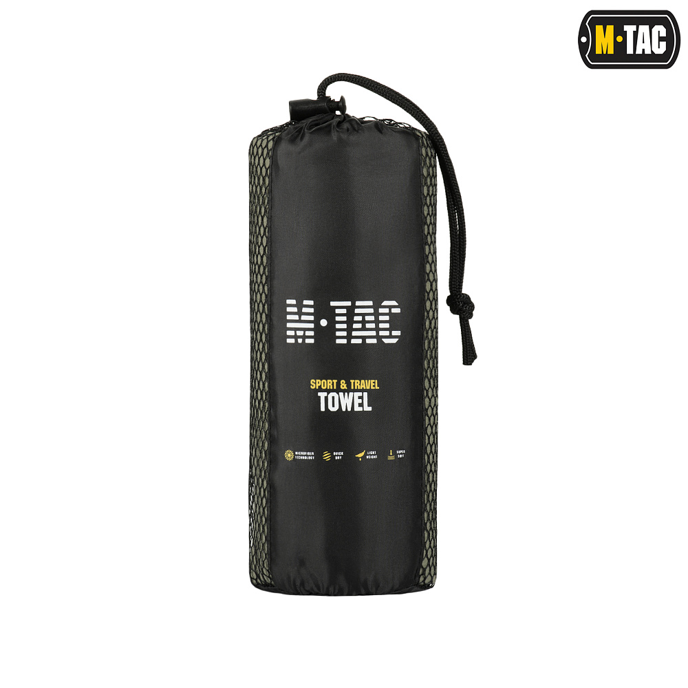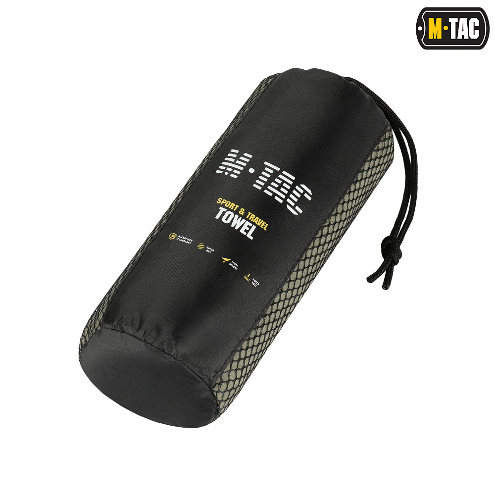 Сбоку полотенца расположена бирка М-Тас с рекомендациями по уходу, которая также может выполнять роль петли для подвешивания. В комплекте с полотенцем идет сетчатый чехол, который закрывается с помощью шнурка с фиксатором.