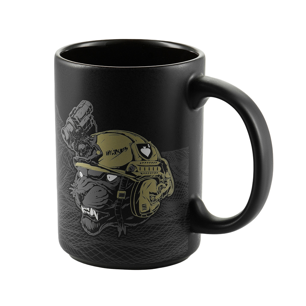 Чашка изготовлена из керамики – материала, отличающегося прочностью, долговечностью, термостойкостью и экологичностью. На ее внешней стороне изображена снайперская винтовка калибра .338, логотип Black Coffee Company, а также пума в шлеме с ПНБ монокуляром. На дне чашки размещено тиснение логотипа.
