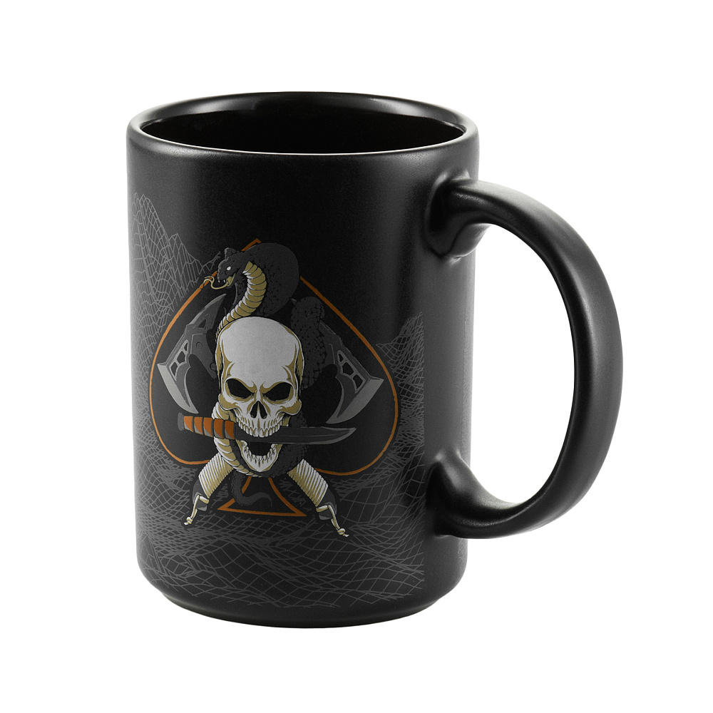 Чашка изготовлена из керамики – материала, отличающегося прочностью, долговечностью, термостойкостью и экологичностью. На ее внешней стороне изображена боевая штурмовая винтовка FN SCAR, логотип Black Coffee Company, а также череп на фоне пики и топоров, который обвивает кобра. На дне чашки размещено тиснение логотипа.