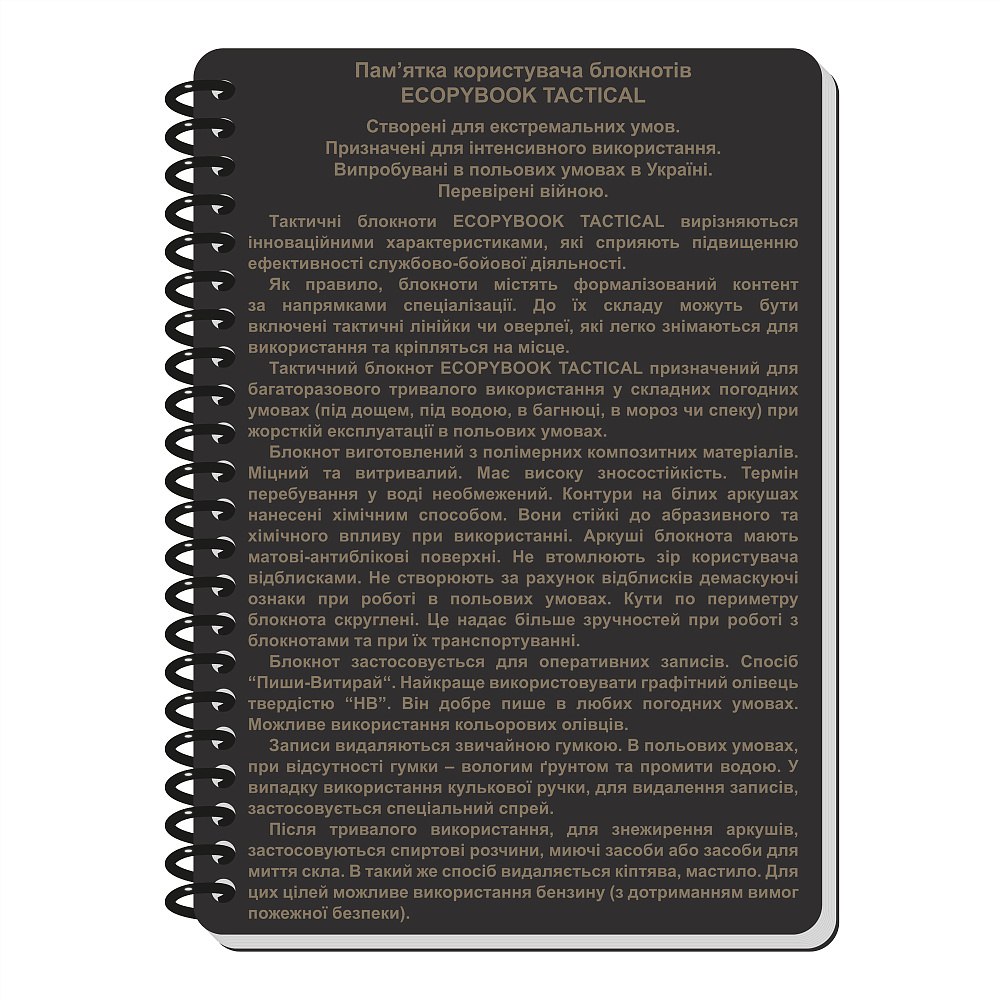 БЛОКНОТ КОМАНДИРА ОТДЕЛЕНИЯ (РАСШ.) от ECOPYBOOK TACTICAL предназначен для многократного долгосрочного использования в сложных погодных условиях.