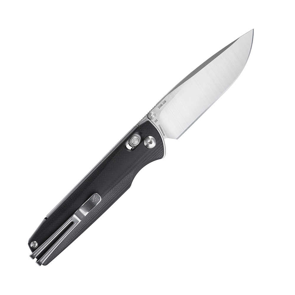 - Рукоять с накладками G10. Стеклотекстолитовые плашки устойчивы к влаге, перепадам температуры и механическим повреждениям, сохраняя целостность и форму независимо от условий. Текстура с легкой шероховатостью обеспечивает цепкий, контролируемый хват.