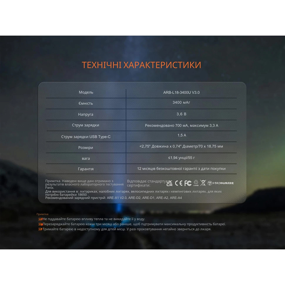 Fenix АКБ 18650 3400 mAh Li-ion V3.0 Type-C