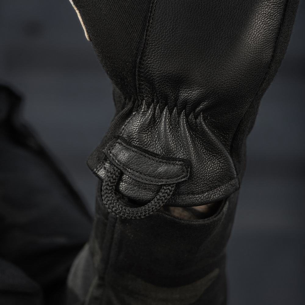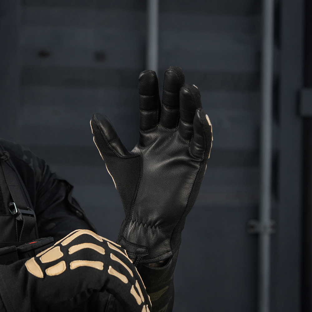 Нижняя часть изделия изготовлена из натуральной кожи. Она покрывает ладонь и внутреннюю часть пальцев, обеспечивая надежное сцепление с различными предметами, включая оружие или инструменты. Кожа добавляет изделию износостойкости, водостойкости и гибкости, а также улучшает общую функциональность перчаток в сложных ситуациях.