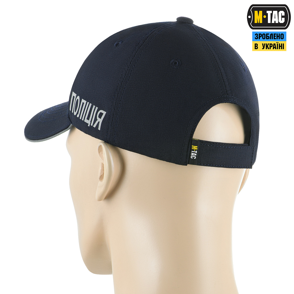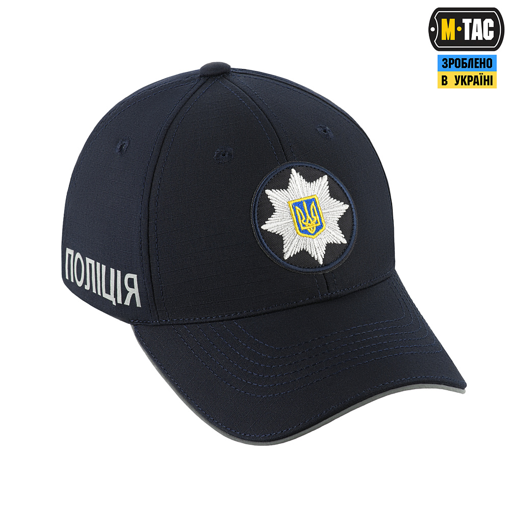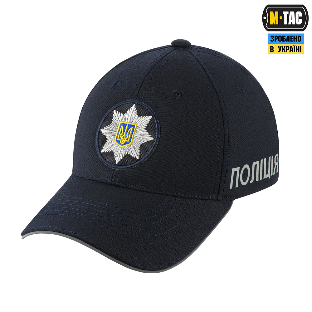 Бейсболка «Полиция» изготовлена согласно требованиям ТО 1844.401085678_101_20. утв. Кабинетом Министров Украины от 18.12.2019 г. № 1055 (Головной убор полицейского Национальной полиции Украины 2020 года. Ключевые особенности: светоотражающие надписи "Поліція" с двух сторон бейсболки, светоотражающий кант вдоль козырька, вышитый логотип НПУ. Изготовлена из хлопковой ткани с добавлением полиэстера, которая не подвергается выгоранию на солнце). Материал изделия: 70% хлопок, 30% полиэстер, Rip-Stop.