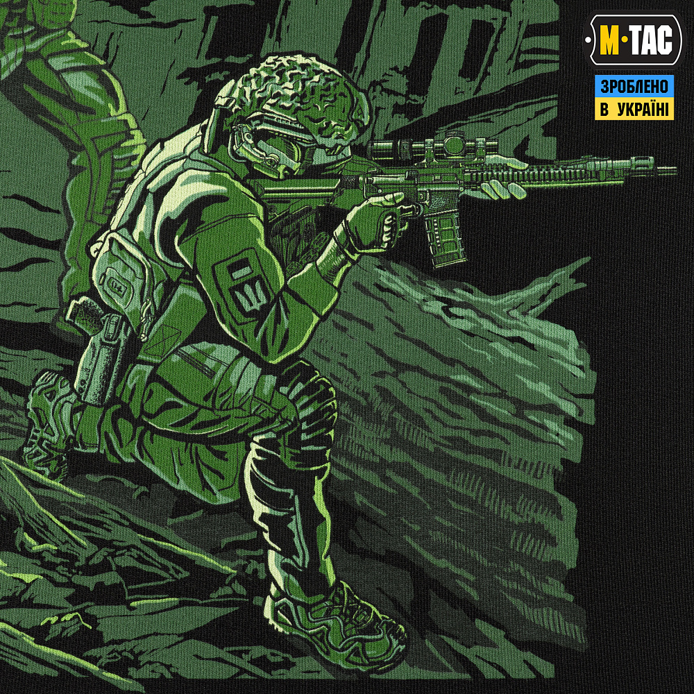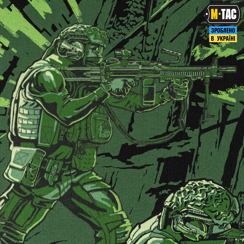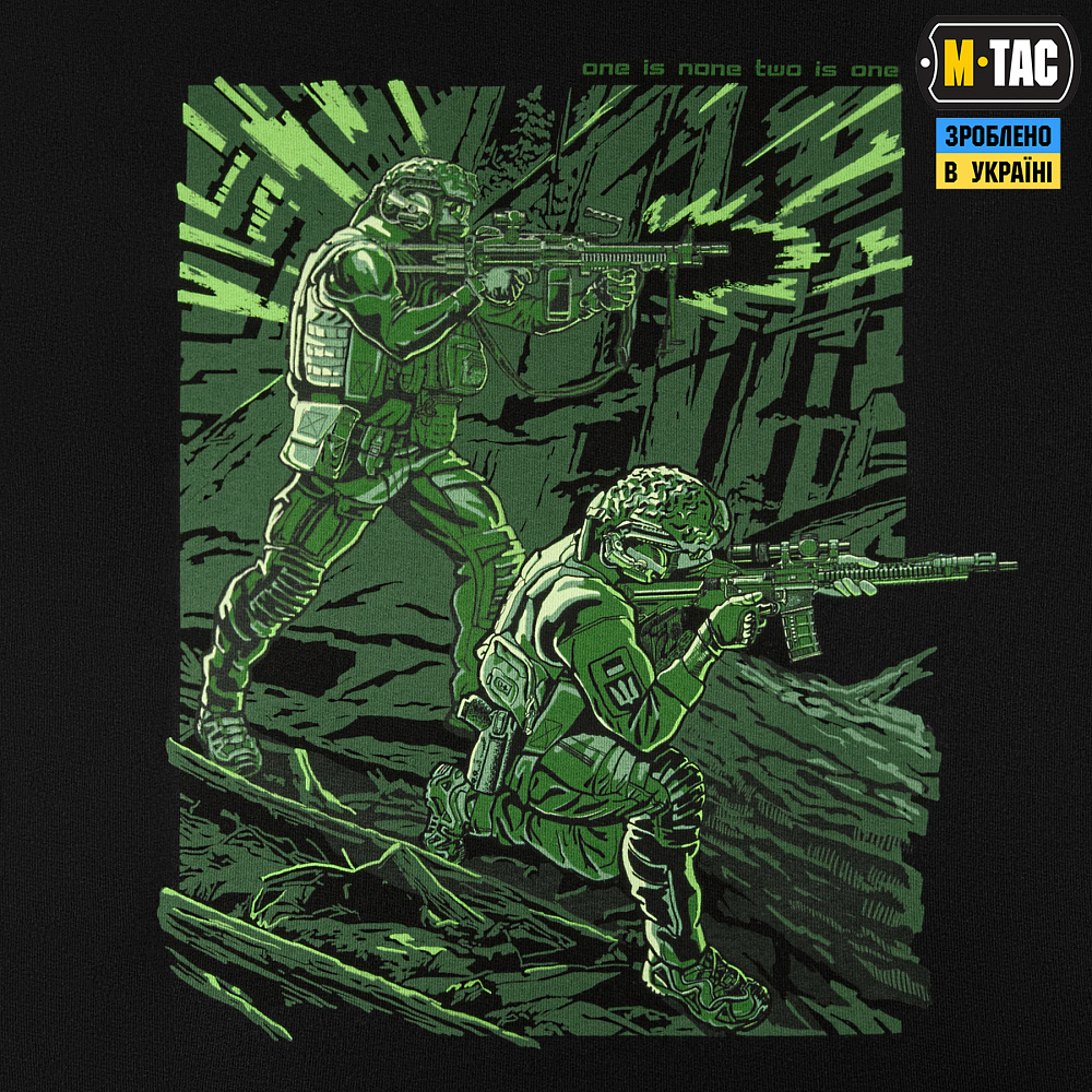 Основой для принта стал эпизод из жизни двух побратимов, изображенный через призму прибора ночного видения. Его дополняют надписи: «one is none two is one» (с англ. - один есть никем, два есть одним) и «бок о бок», которые являются символами ценности братства в самых тяжелых испытаниях борьбы.