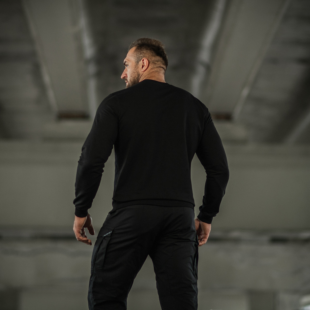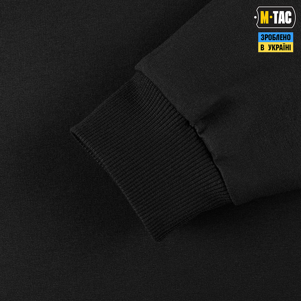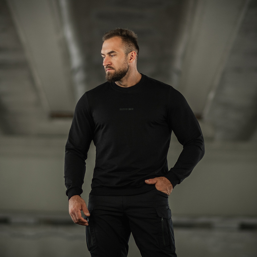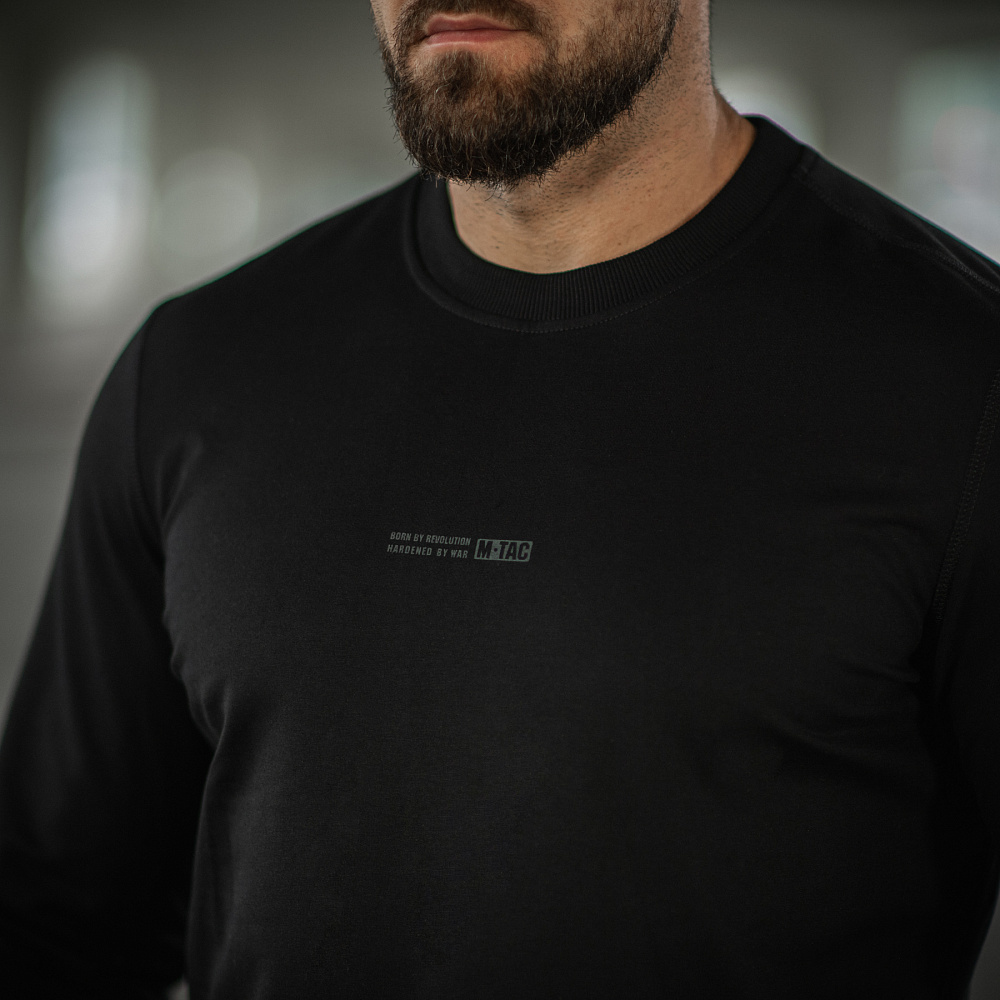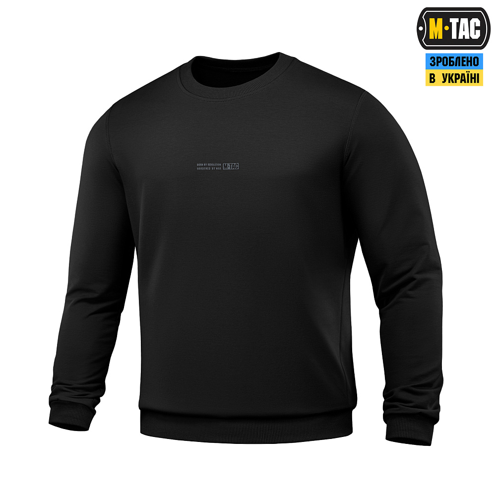 Внешне свитшот выглядит сдержанно и одновременно выразительно. На груди расположено небольшое лого M-Tac и лозунг бренда «Born by Revolution - Hardened by War». Слоган освещает идею бренда M-Tac, который сформировался в бурный для страны период, и с тех пор опирается на принципы стойкости и решительности, поддерживая тех, кто не боится вызовов - как в повседневной жизни, так и в экстремальных обстоятельствах.