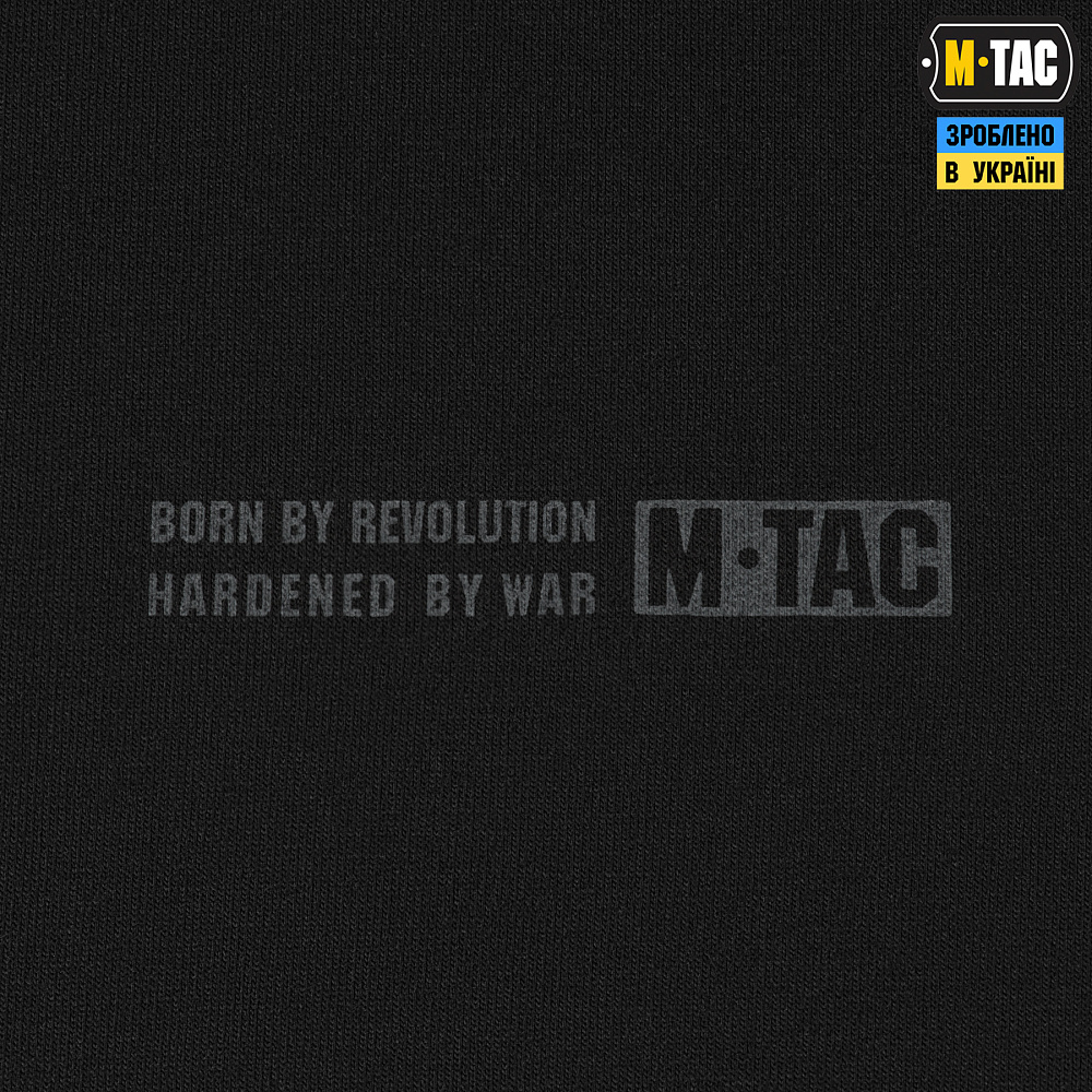 На груди свитшота нанесен логотип М-Тас, а также лозунг бренда: Born by Revolution - Hardened by War, что в переводе означает "Рожденный революцией - закаленный войной".