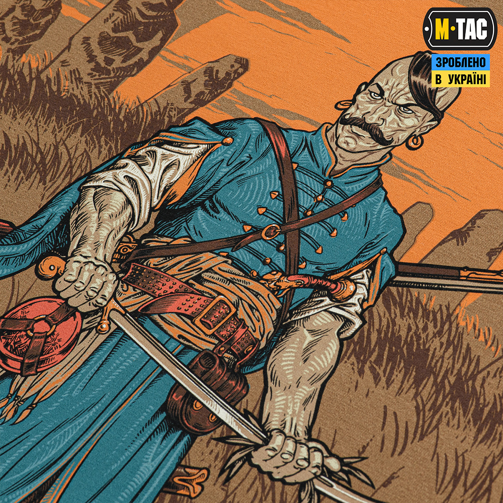На принте футболки изображен казак, который чистит свою саблю от вражеской крови травой. Его образ является напоминанием, что только мы являемся хозяевами украинской земли, а кто придет к нам с оружием в руках - от него и погибнет. На принте также изображен сокол, который в славянской мифологии выступал символом посредничества между миром живых и мертвых. Поэтому души всех уничтоженных оккупантов, он будет доставлять в самый ад. Фон окрашивает восход украинского солнца и знаменитые "половецкие бабы" - олицетворение многовековой украинской истории.
