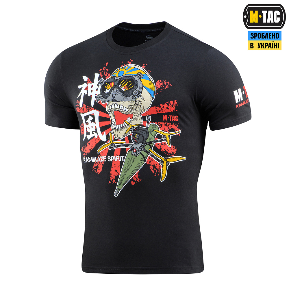 На принте изображен стилизованный череп в FPV-очках и патриотической желто-голубой повязке на фоне "солнечного флага", известного в Японии как Хиномара ("круг солнца" или "круг огня"). Слева изображен дрон-камикадзе, оснащенный выстрелом РПГ, что является одной из распространенных и эффективных разновидностей его применения для уничтожения вражеской техники. Название футболки "KAMIKAZE SPIRIT" полностью отражает идеологию и деятельность операторов FPV дронов, которые сегодня воспроизводят давние традиции японских пилотов-камикадзе, но в контексте современных реалий.