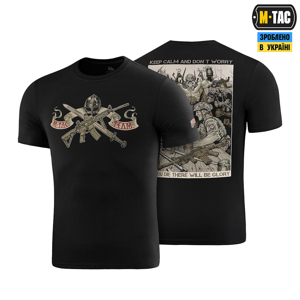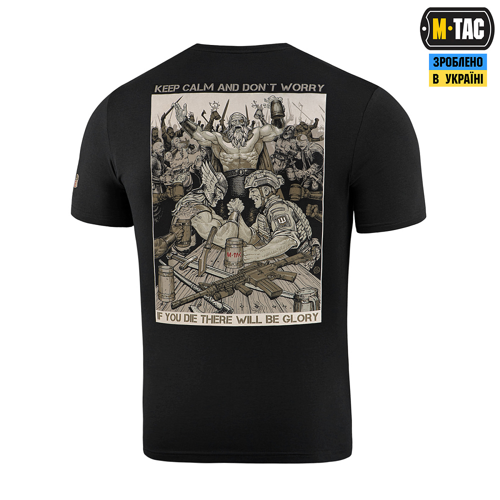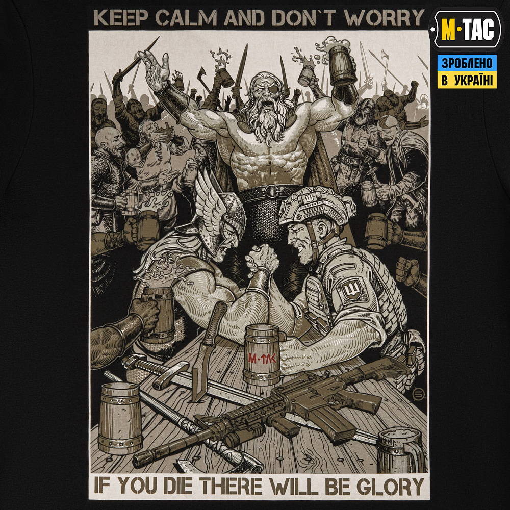 На принте футболки изображен сюжет, на котором украинский защитник попадает в Валгаллу. Там с одним из древних воинов, он сошелся в дуэли по армреслингу, а время до начала поединка для них отсчитывает сам Один. Надписи на принте "KEEP CALM AND DON'T WORRY" и "IF YOU DIE THERE WILL BE GLORY" символизируют славу для каждого защитника родной земли, даже после смерти.
