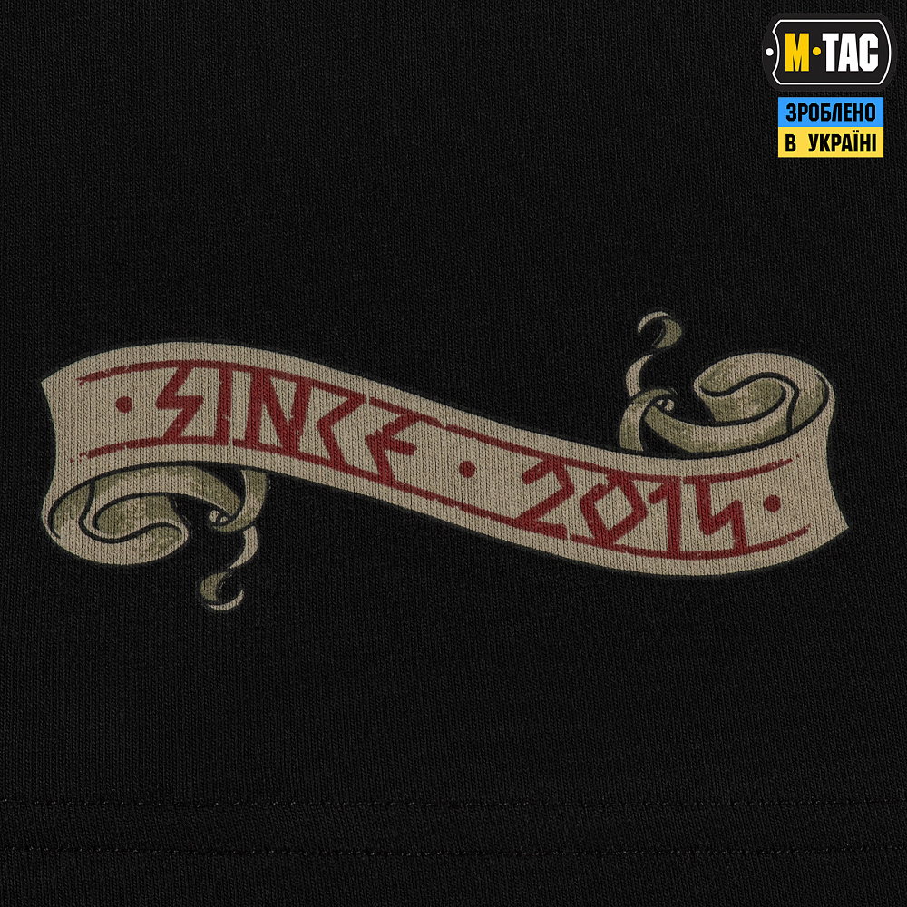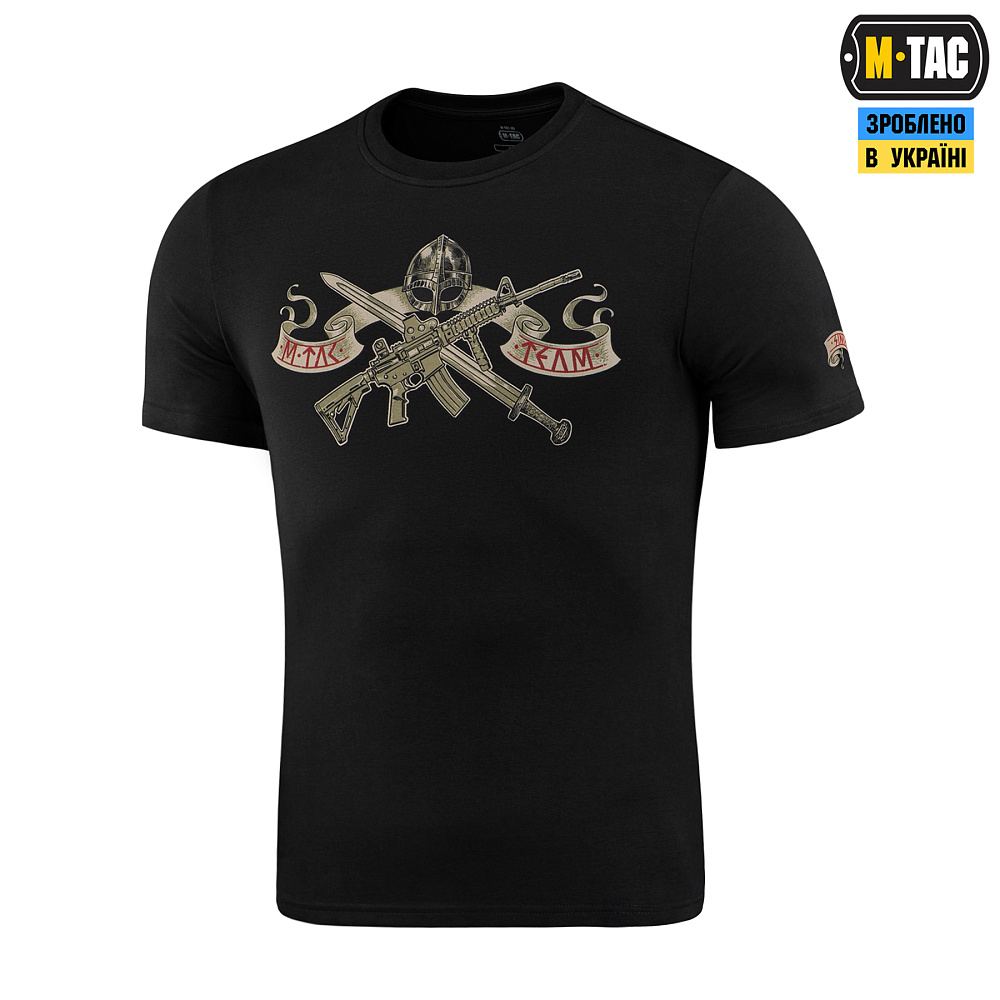 На передней части футболки изображены винтовка и меч, скрещённые между собой. За ними — скандинавский шлем с лентой, на которой рунным стилем написано “M-Tac Team”.
