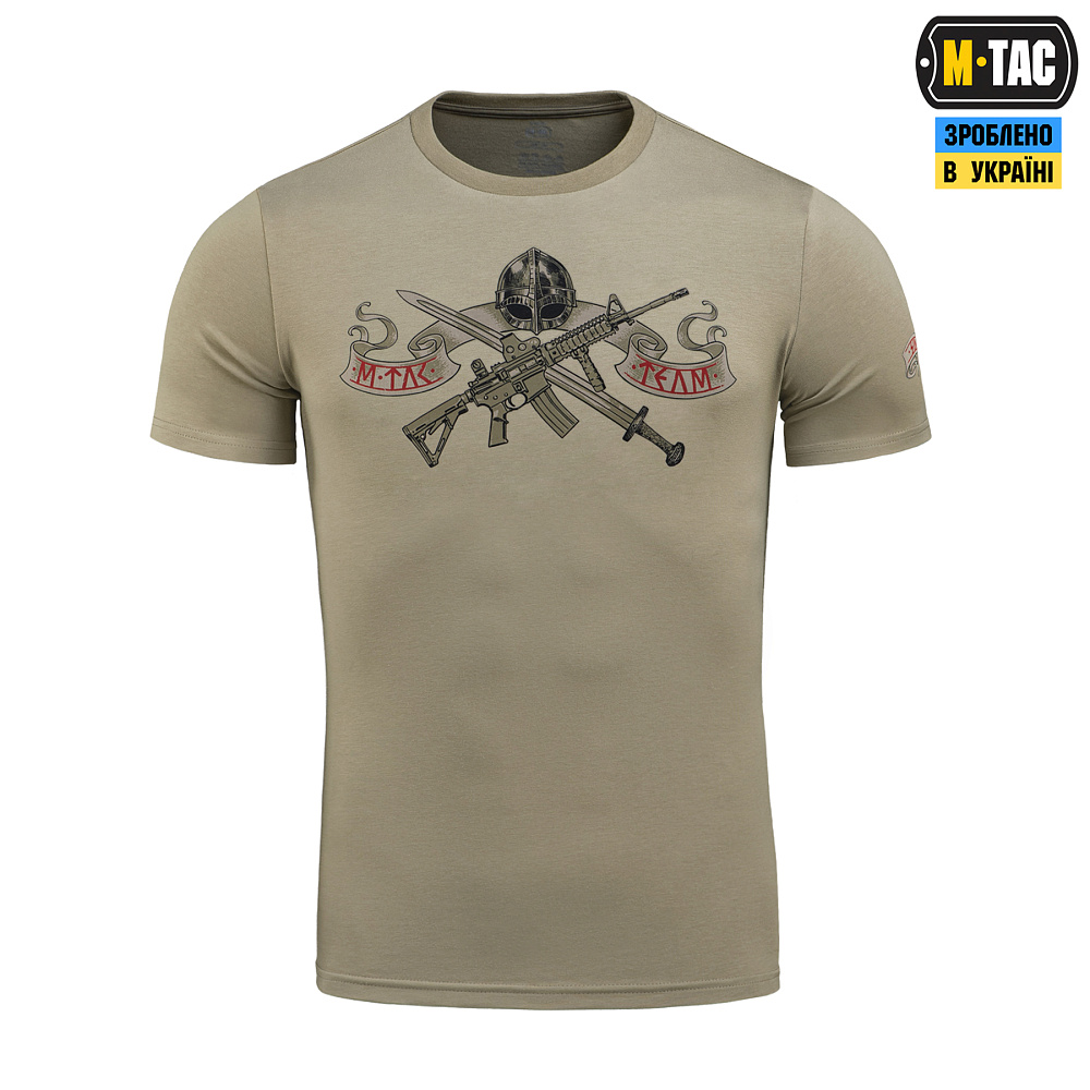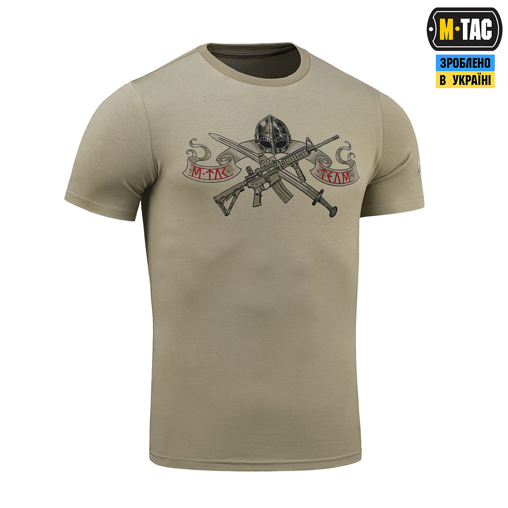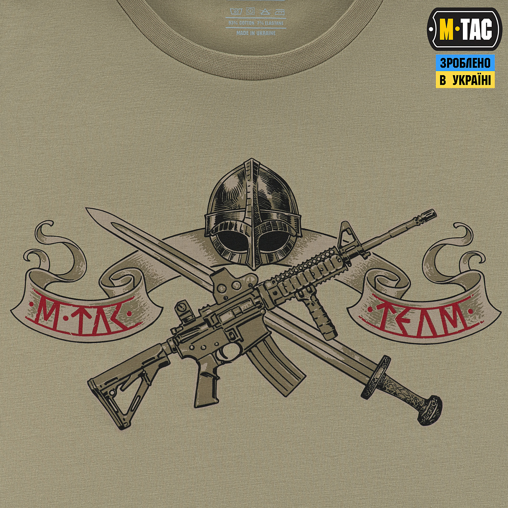 На передней части футболки изображены винтовка и меч, скрещённые между собой. За ними — скандинавский шлем с лентой, на которой рунным стилем написано “M-Tac Team”.