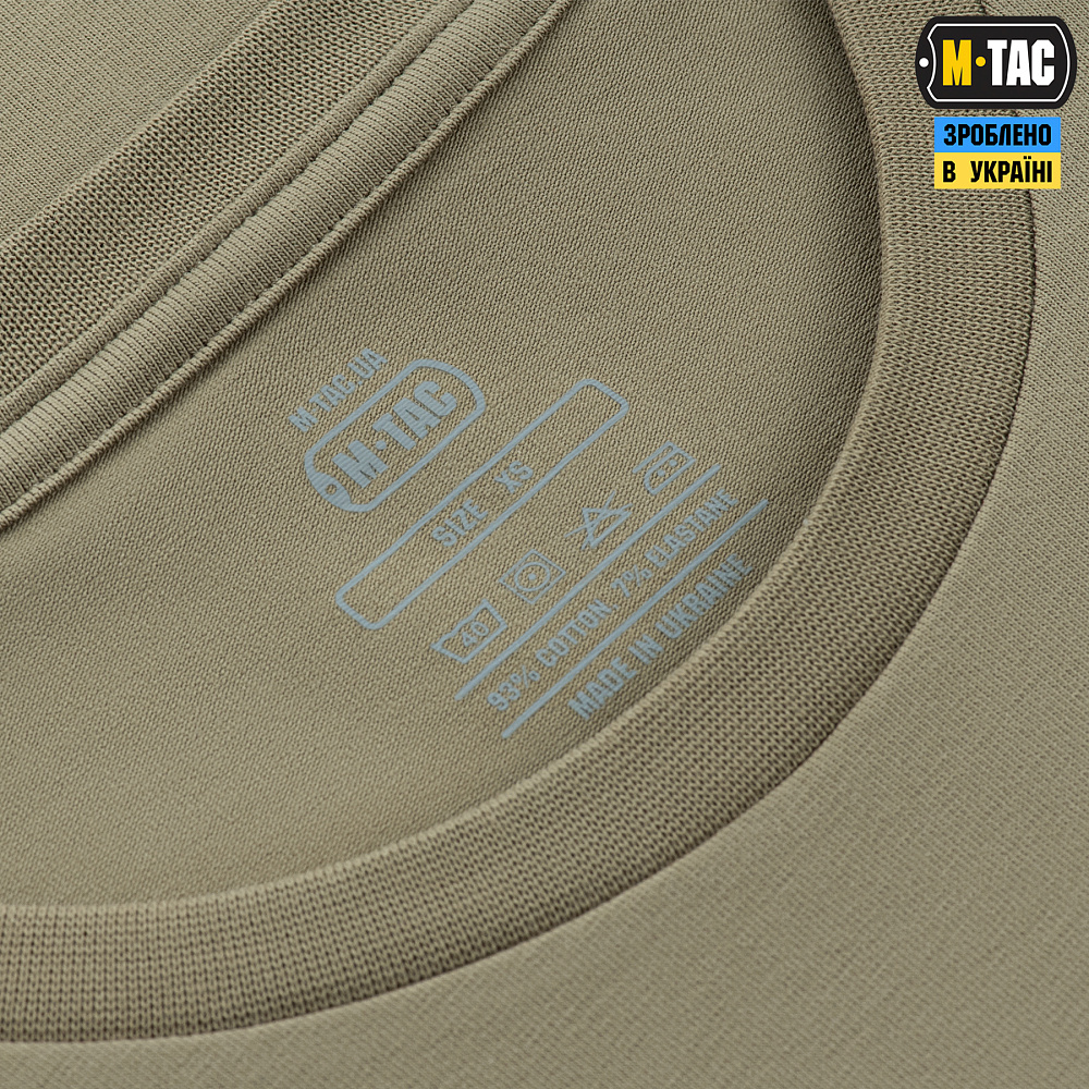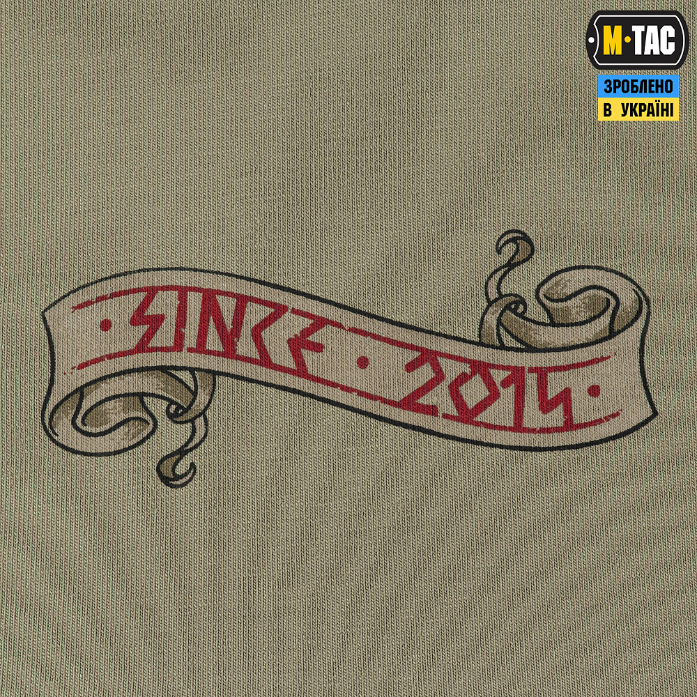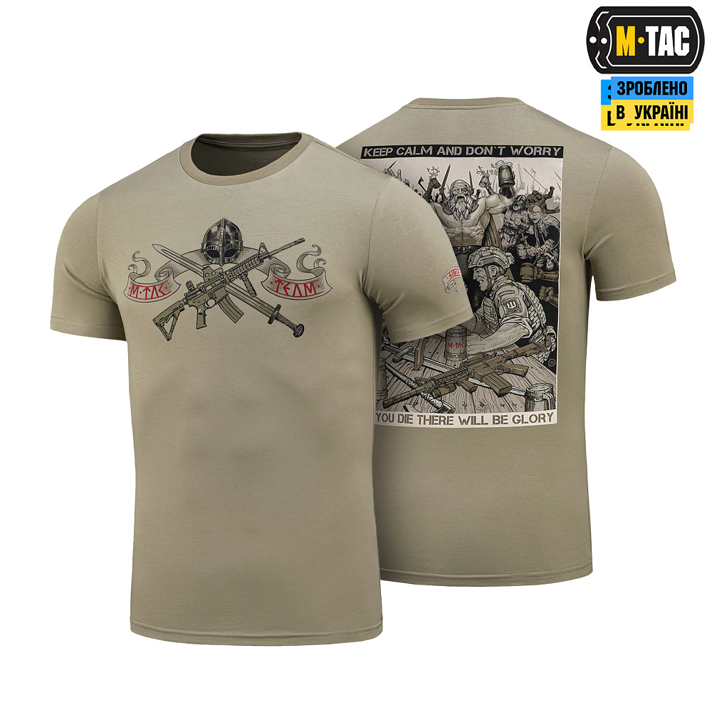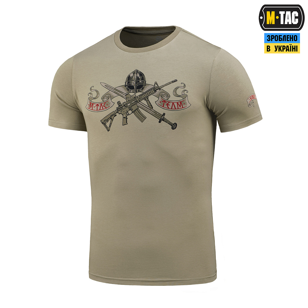 На передней части футболки изображены винтовка и меч, скрещённые между собой. За ними — скандинавский шлем с лентой, на которой рунным стилем написано “M-Tac Team”.