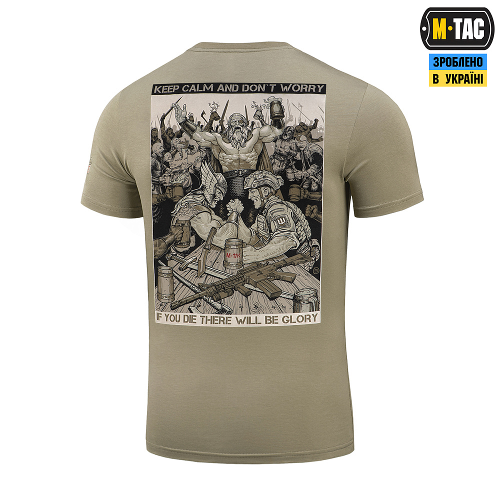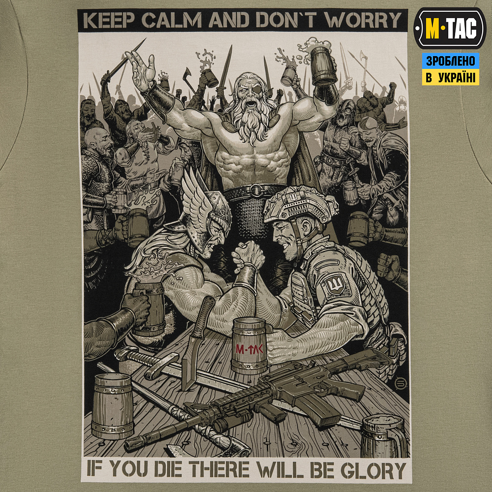 На принте футболки изображен сюжет, на котором украинский защитник попадает в Валгаллу. Там с одним из древних воинов, он сошелся в дуэли по армреслингу, а время до начала поединка для них отсчитывает сам Один. Надписи на принте "KEEP CALM AND DON'T WORRY" и "IF YOU DIE THERE WILL BE GLORY" символизируют славу для каждого защитника родной земли, даже после смерти.