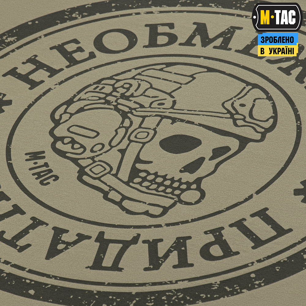 Спереди на футболке нанесен уже легендарный принт от М-Тас. Это череп в баллистическом шлеме, вокруг которого расположена надпись «необмежено придатний». Принт обрамлен двумя темными кругами разной толщины.
