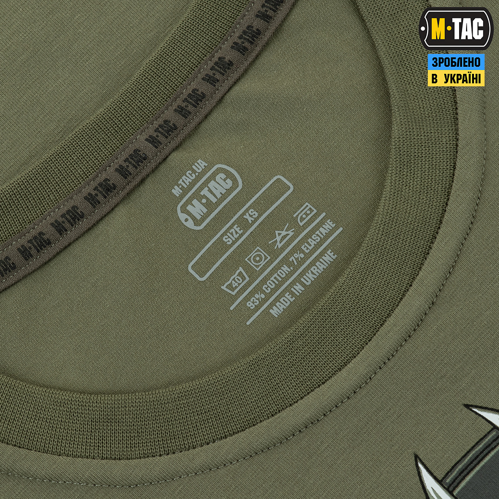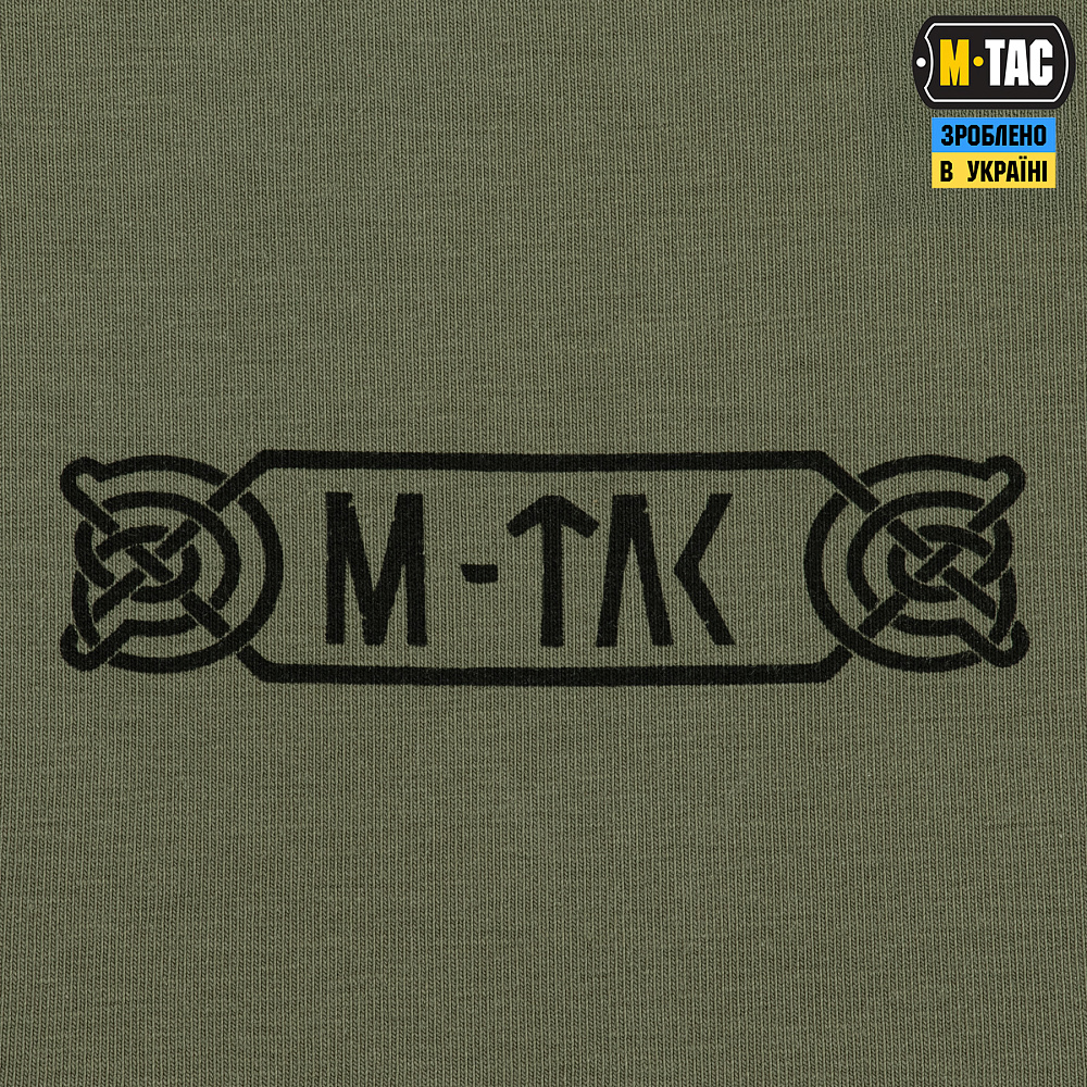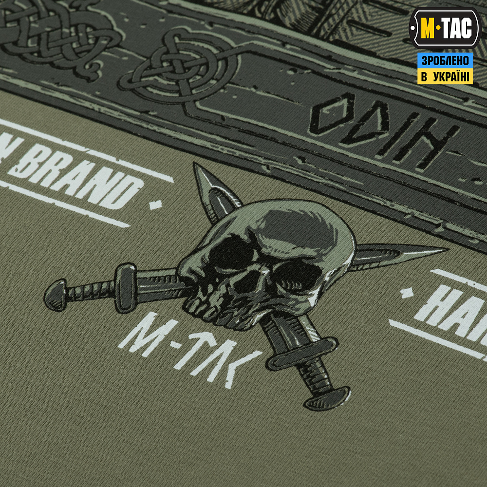 Нижняя часть принта напоминает украшенную резьбой лодку викингов с надписью Odin. Ниже размещены фразы «Ukrainian brand» и «Hardened by war», разделенные изображением черепа и двумя перекрытыми клинками. Под ними надпись «М-Тас».