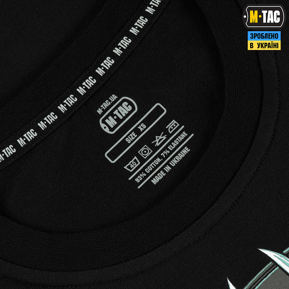 Нижняя часть принта напоминает украшенную резьбой лодку викингов с надписью Odin. Ниже размещены фразы «Ukrainian brand» и «Hardened by war», разделенные изображением черепа и двумя перекрытыми клинками. Под ними надпись «М-Тас».
