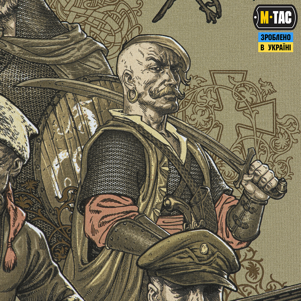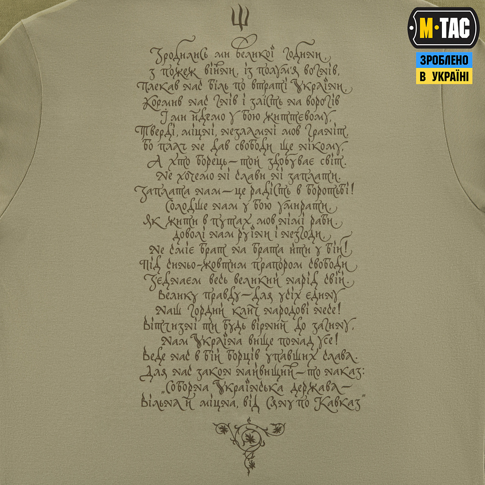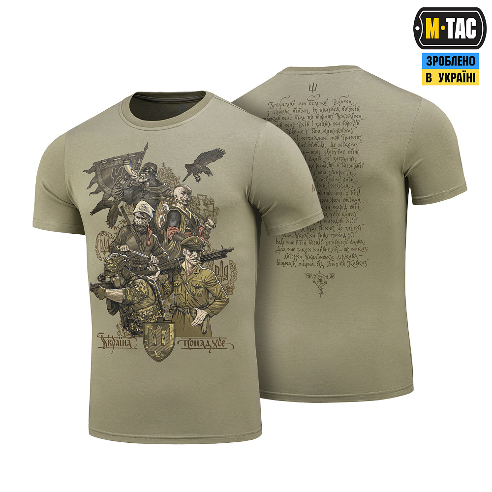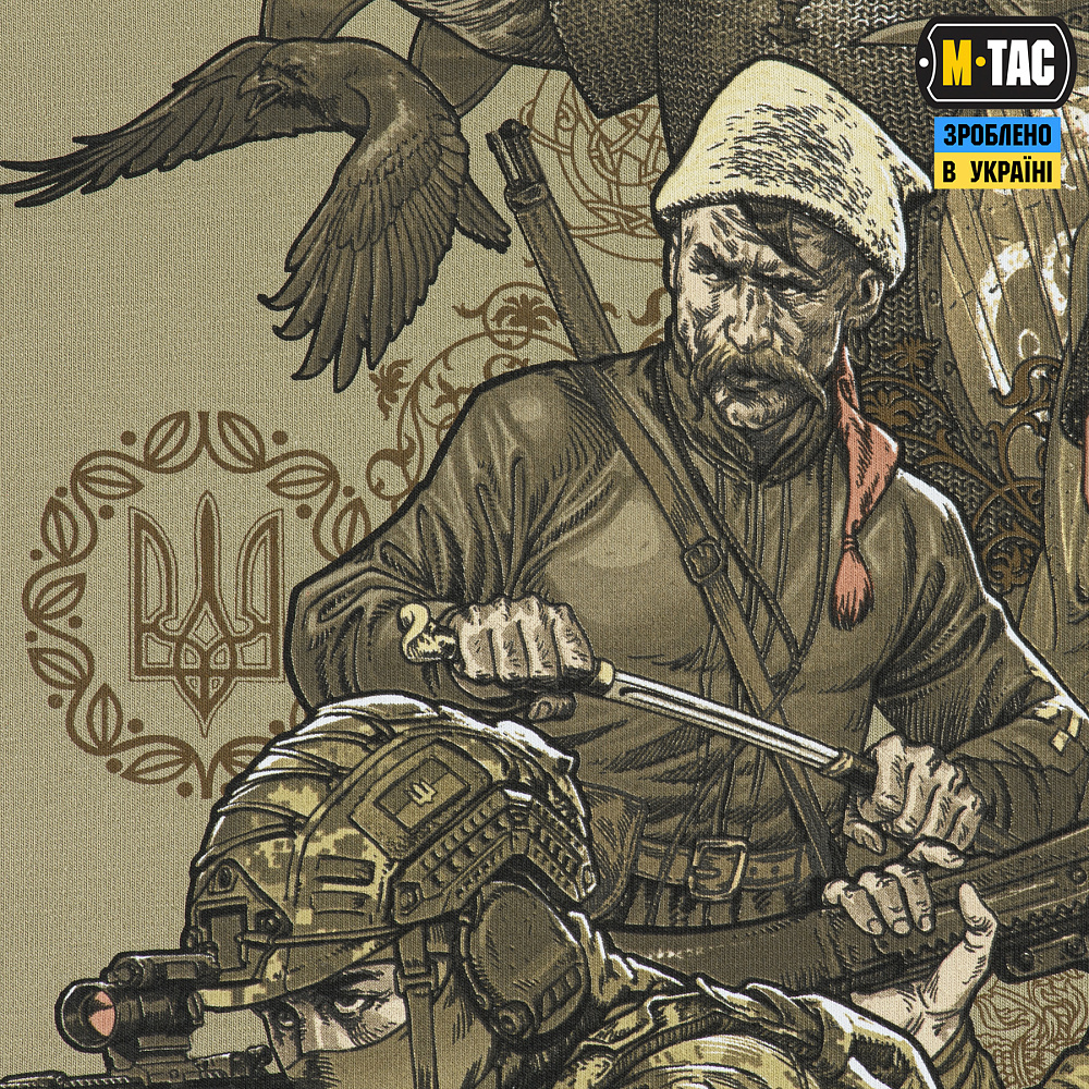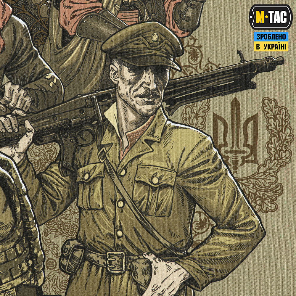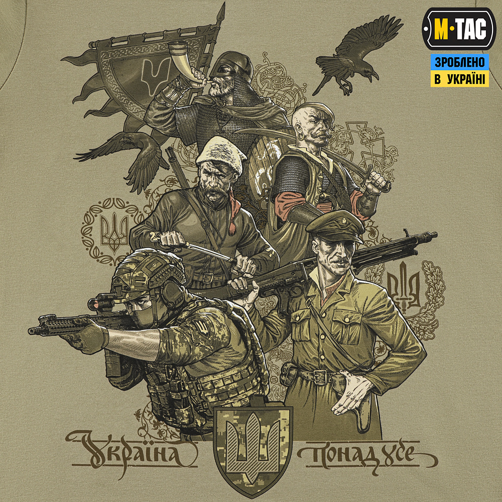 На принте изображены разные поколения украинских воинов, объединенные одной целью - борьбой за независимость Украины. На спине футболки размещен текст "Марша Украинских Националистов", гимна ОУН, который на протяжении многих лет является символом украинского освободительного духа.