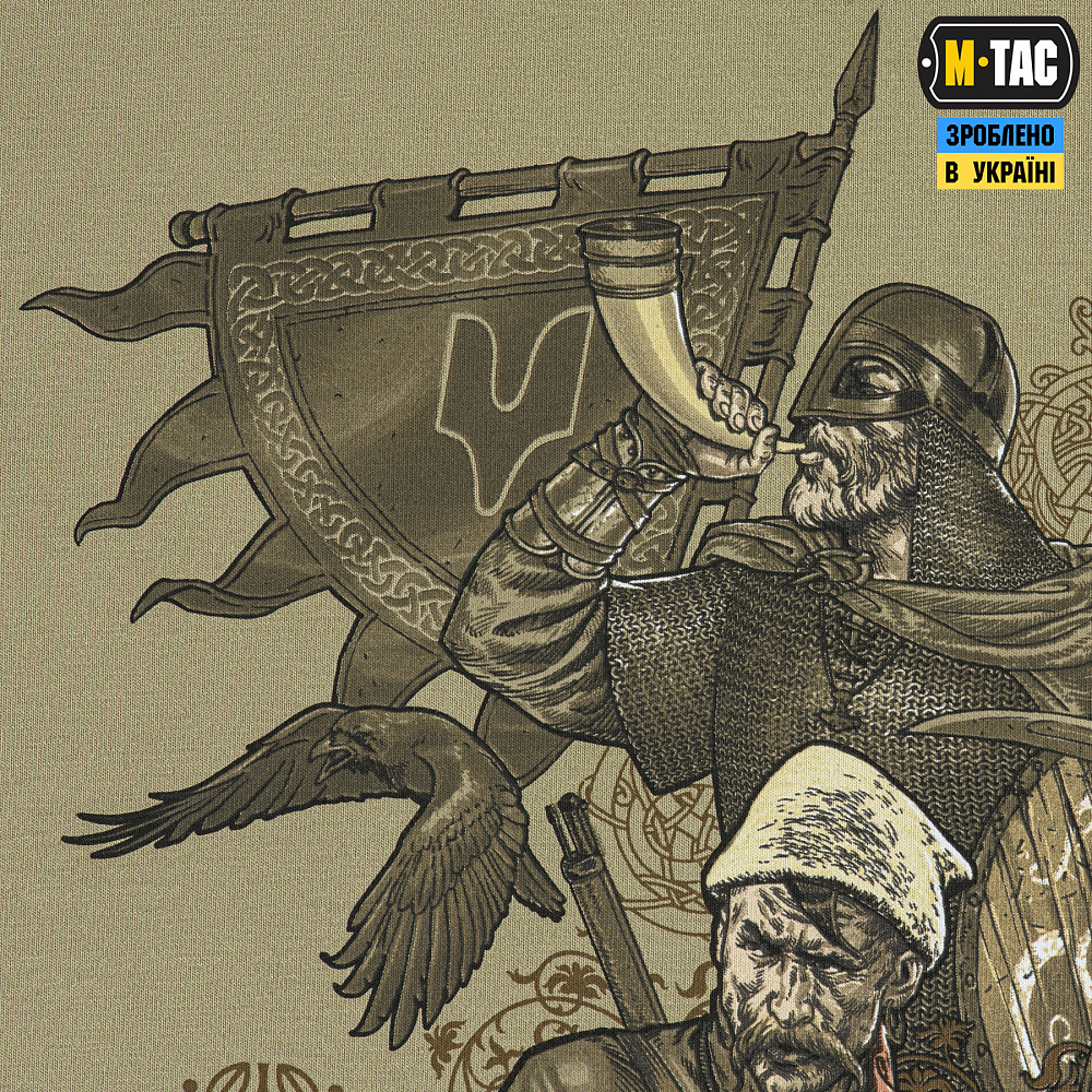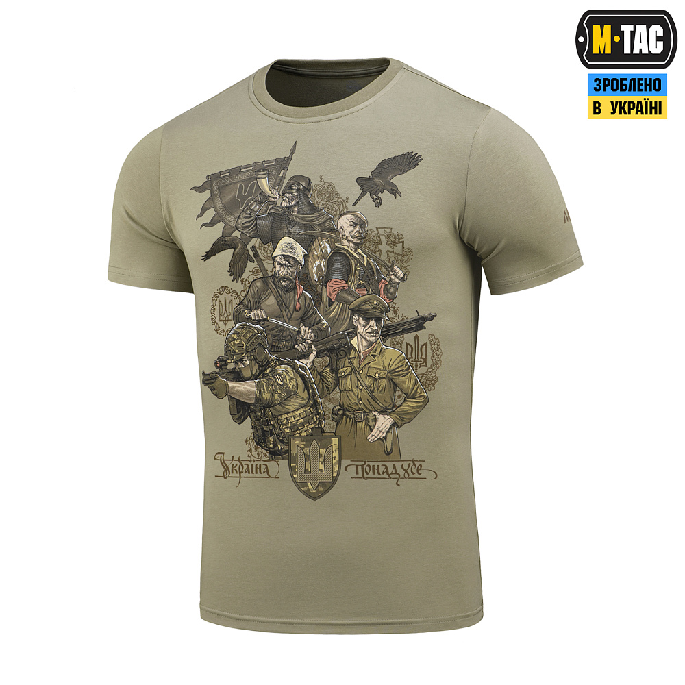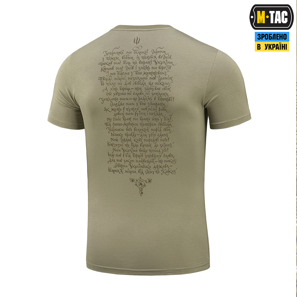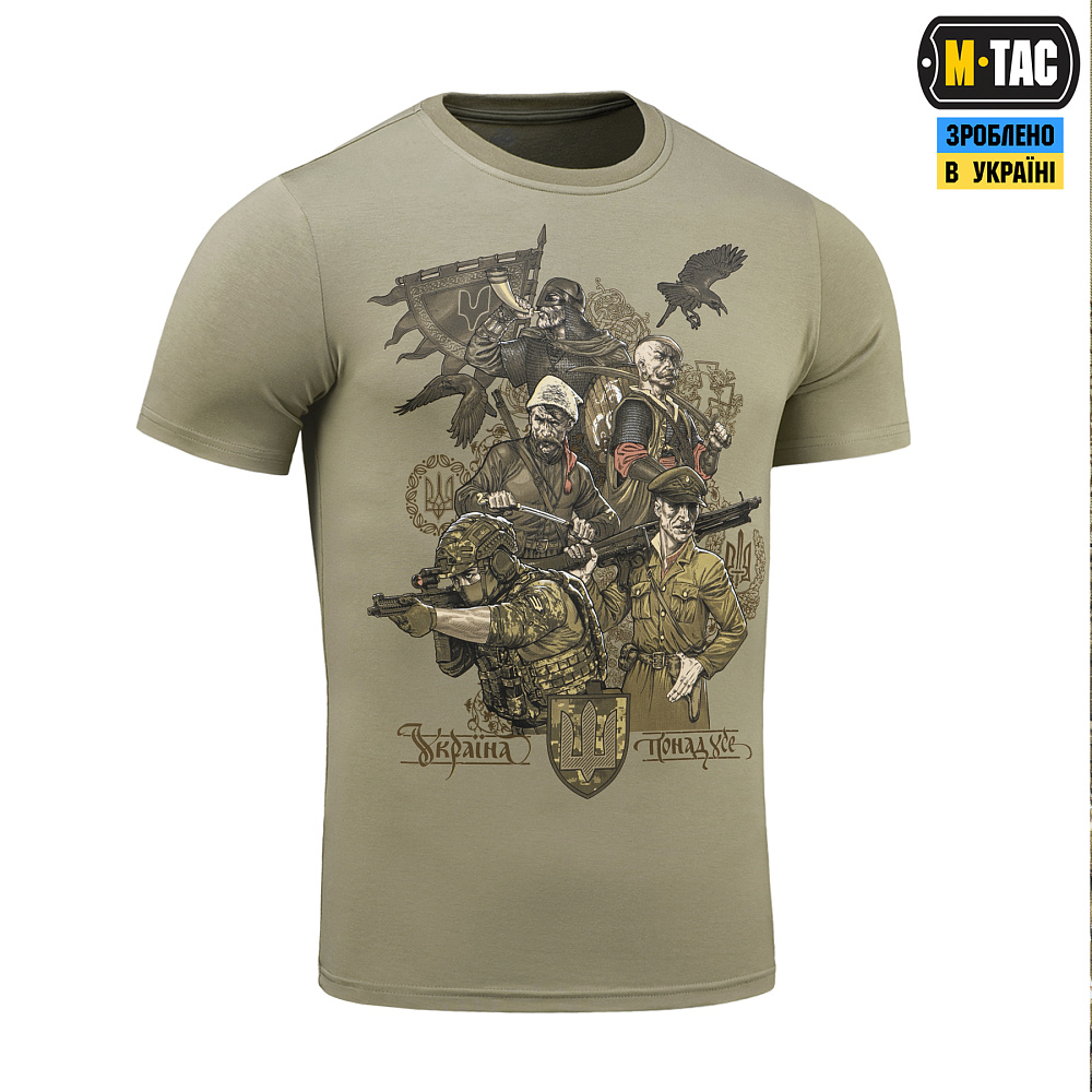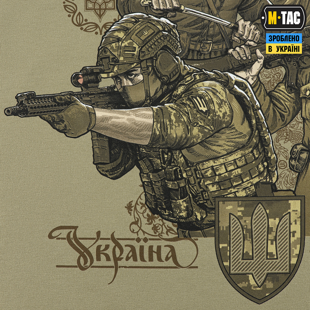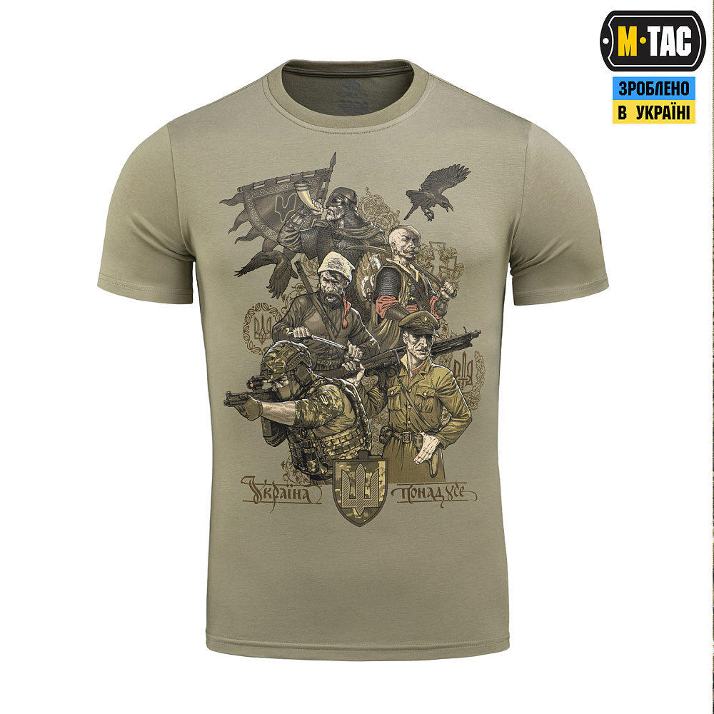 На принте изображены разные поколения украинских воинов, объединенные одной целью - борьбой за независимость Украины. На спине футболки размещен текст "Марша Украинских Националистов", гимна ОУН, который на протяжении многих лет является символом украинского освободительного духа.