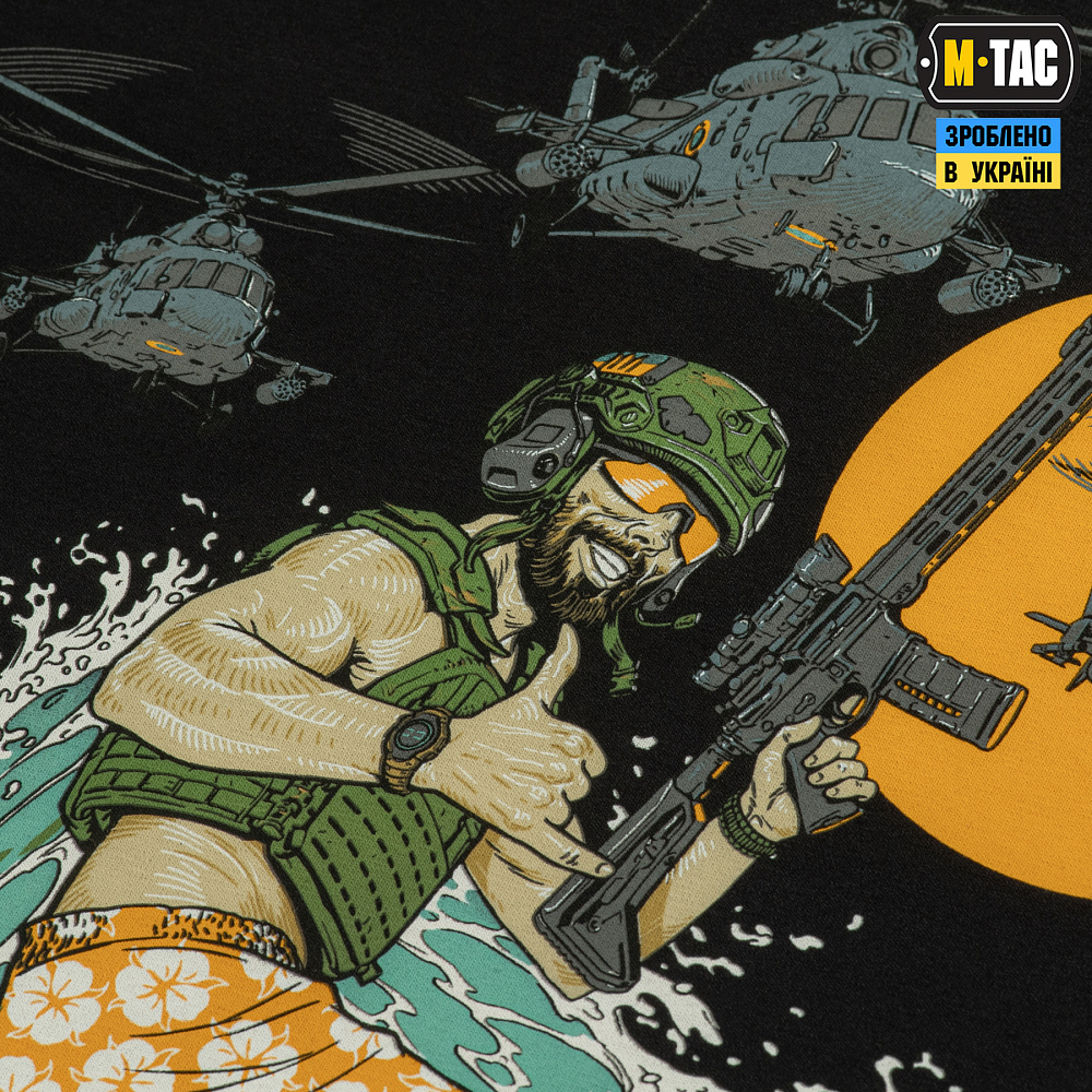 На принте изображен стилизованный спецназовец с AR-15 в руках и одет в шлем, бронежилет и шорты. Рисунок на шортах бойца символически намекает, что он везет оккупантам очередную порцию «бавовни». Как искусный серфер, поймав волну и почувствовав драйв на пути к цели, он готов выполнить боевое задание. Вертолетное звено (два Ми-8 и Ми-24) сопровождает бойца, умело маневрируя в небе и обеспечивая ему полную огневую поддержку. На рукаве изображен стилизованный Веселый Роджер, что на волнах отваги, характерной для настоящих смельчаков, призывает врага капитулировать.