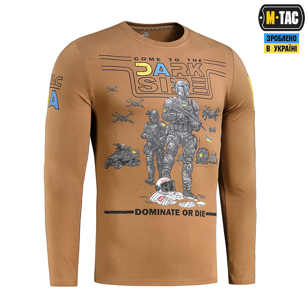 В основной части принта на груди написано “Переходи на тёмную сторону” и ниже “Доминируй или умри” с оригинальным изображением в виде украинских космонавтов с оружием, которые стоят на трупах советских врагов. На рукавах с одной стороны расположен красивый логотип “M-Tac UA”, а с другой – силуэт украинского герба, в котором можно разглядеть истребитель “Тёмной стороны”. Футболка максимально подходит для использования при активном образе жизни – охота, рыбалка, занятия спортом, туризм. Тонкий эластичный и качественный трикотаж удачно подчеркивает фигуру и дает полное ощущение комфорта.