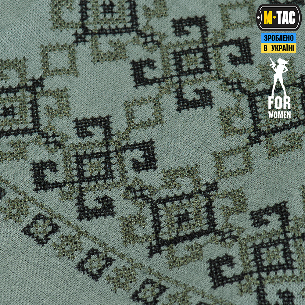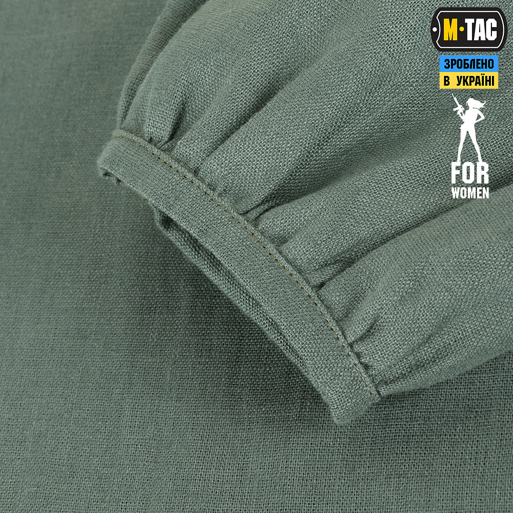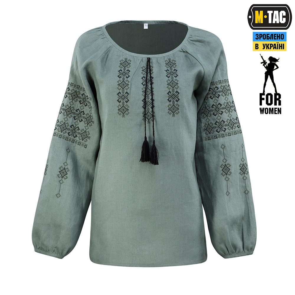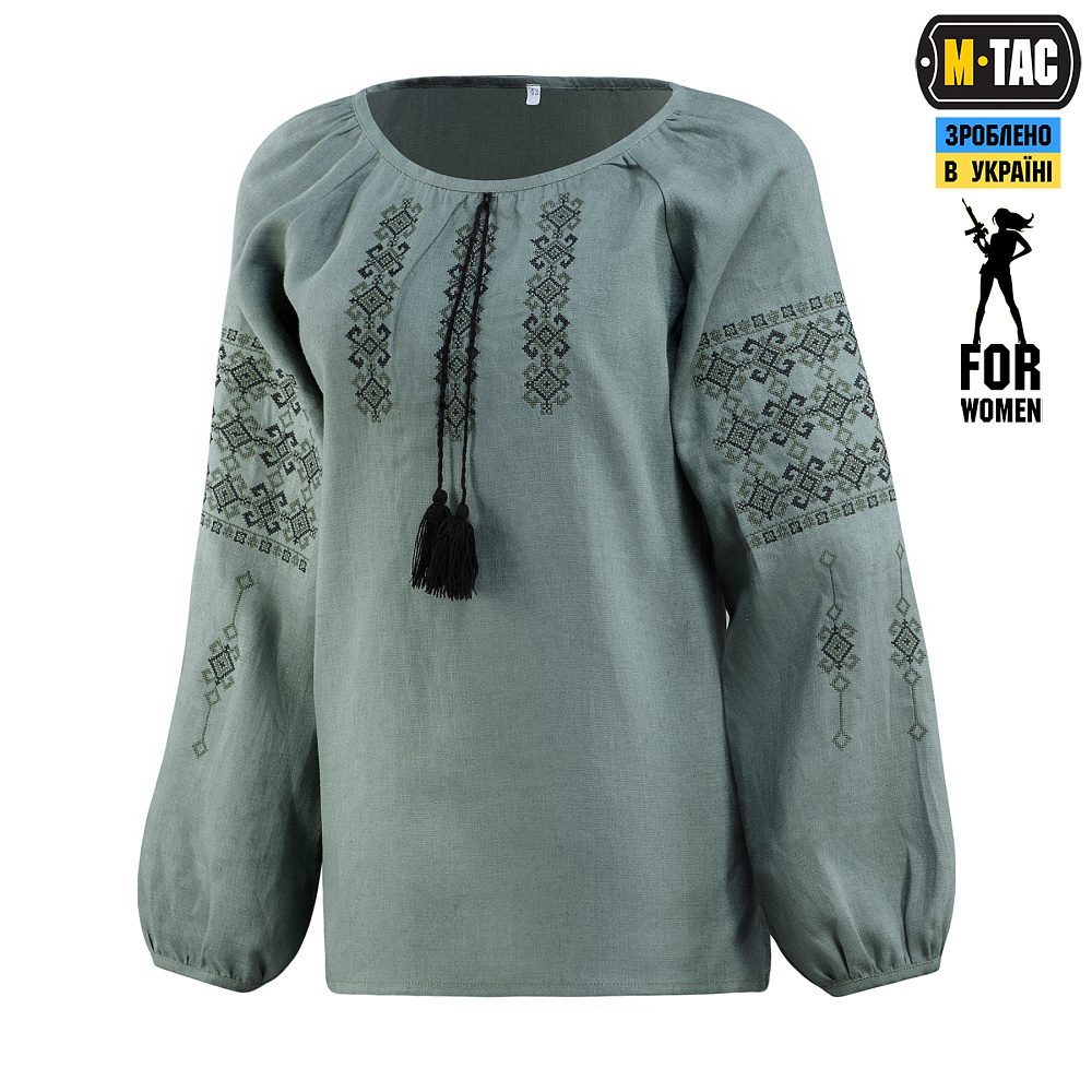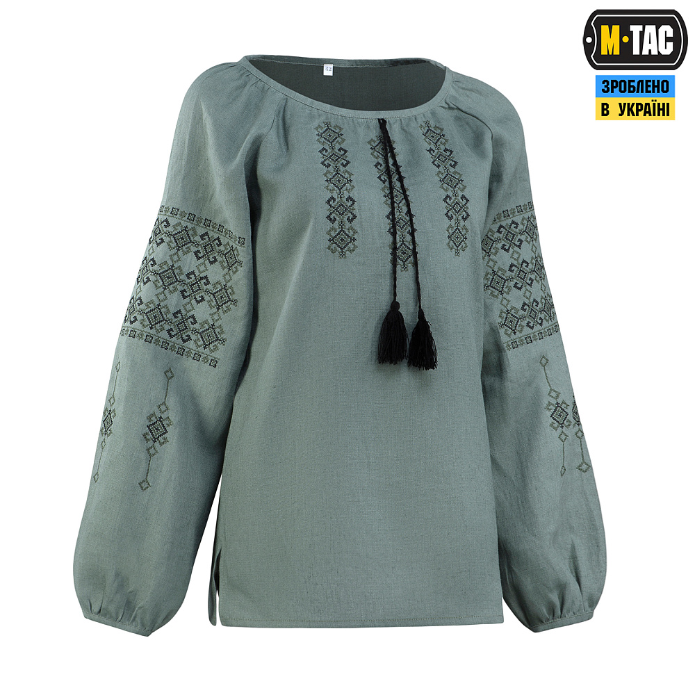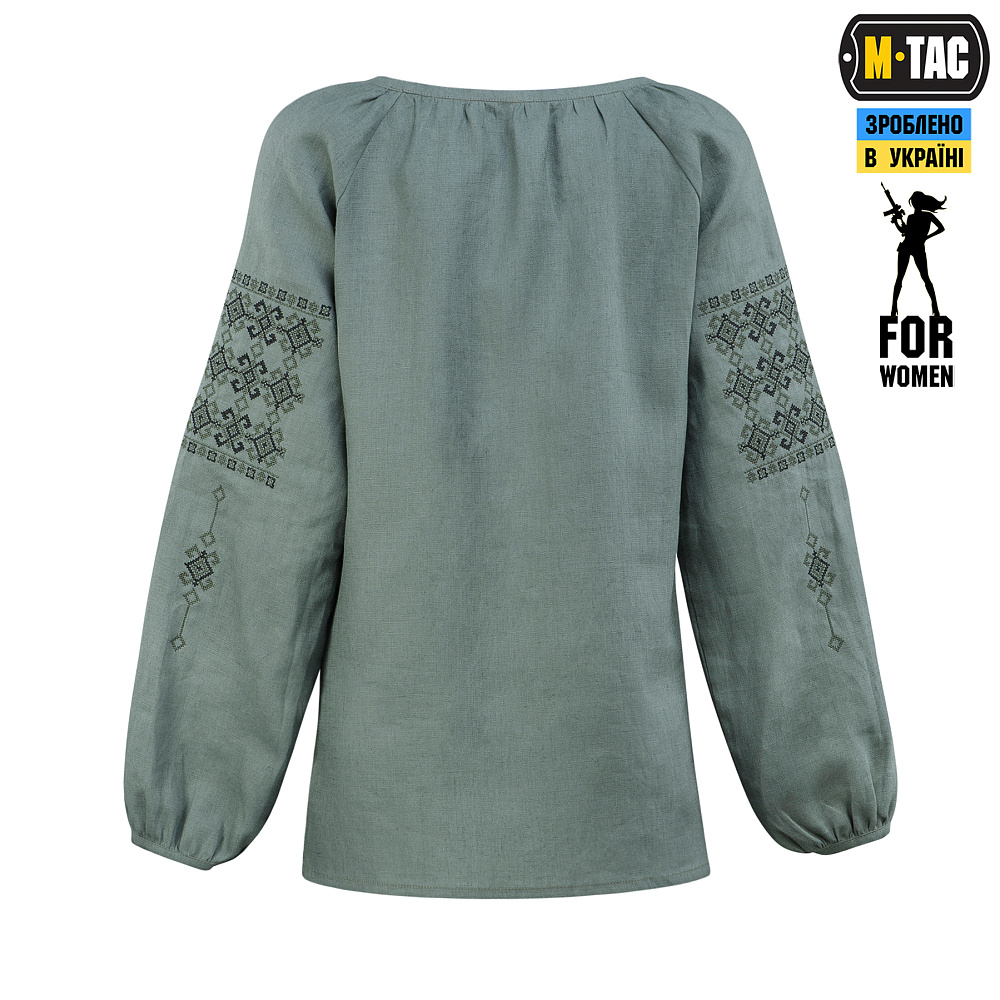 Именно в таком ракурсе бренд М-ТАС и представляет свою новинку — женскую вышиванку из 100% льна в серо-зеленом цвете.