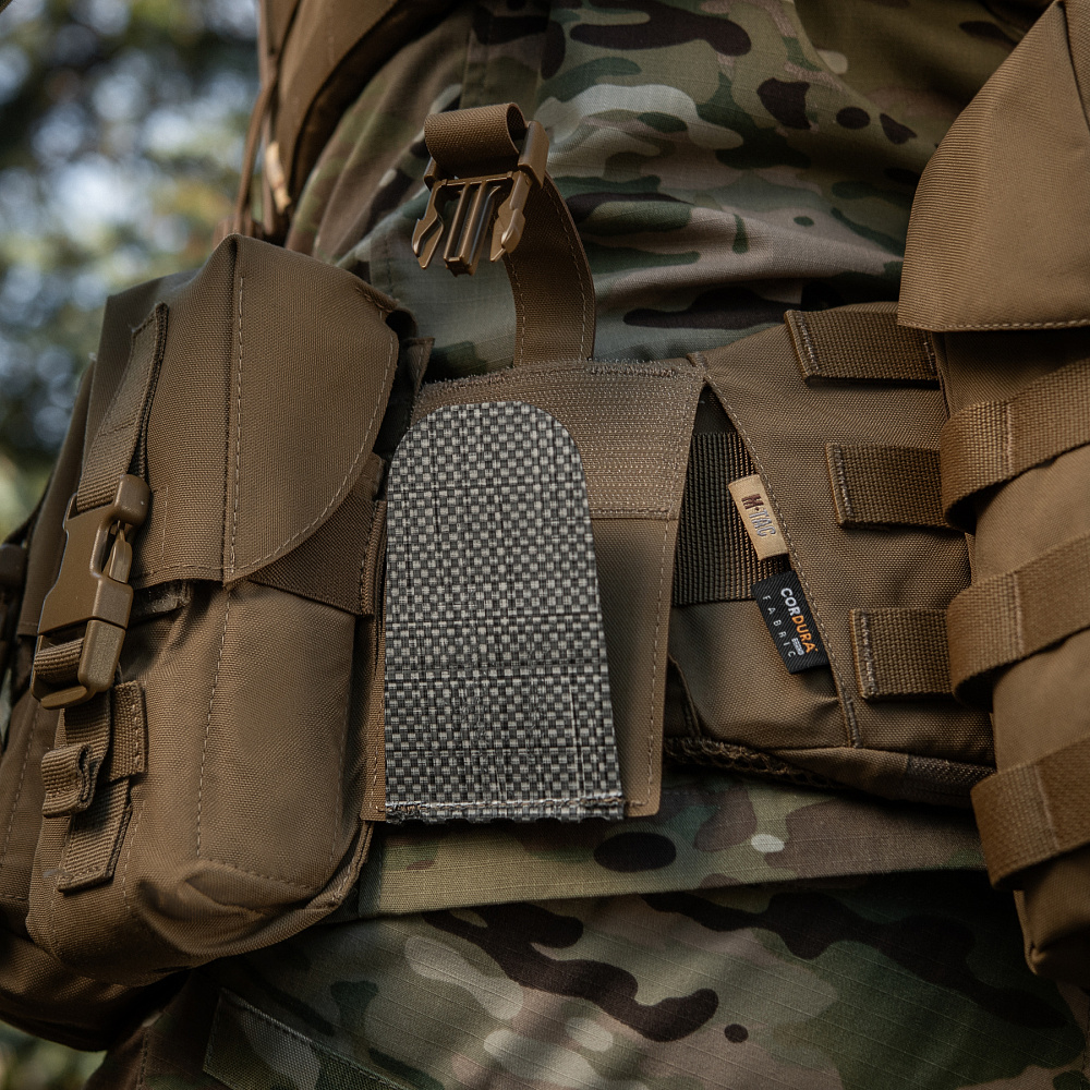 По бокам подсумка расположены дополнительные вставки с панелями МОЛЛИ для крепления дополнительного снаряжения или размещения медицинских принадлежностей, например тактических ножниц.
