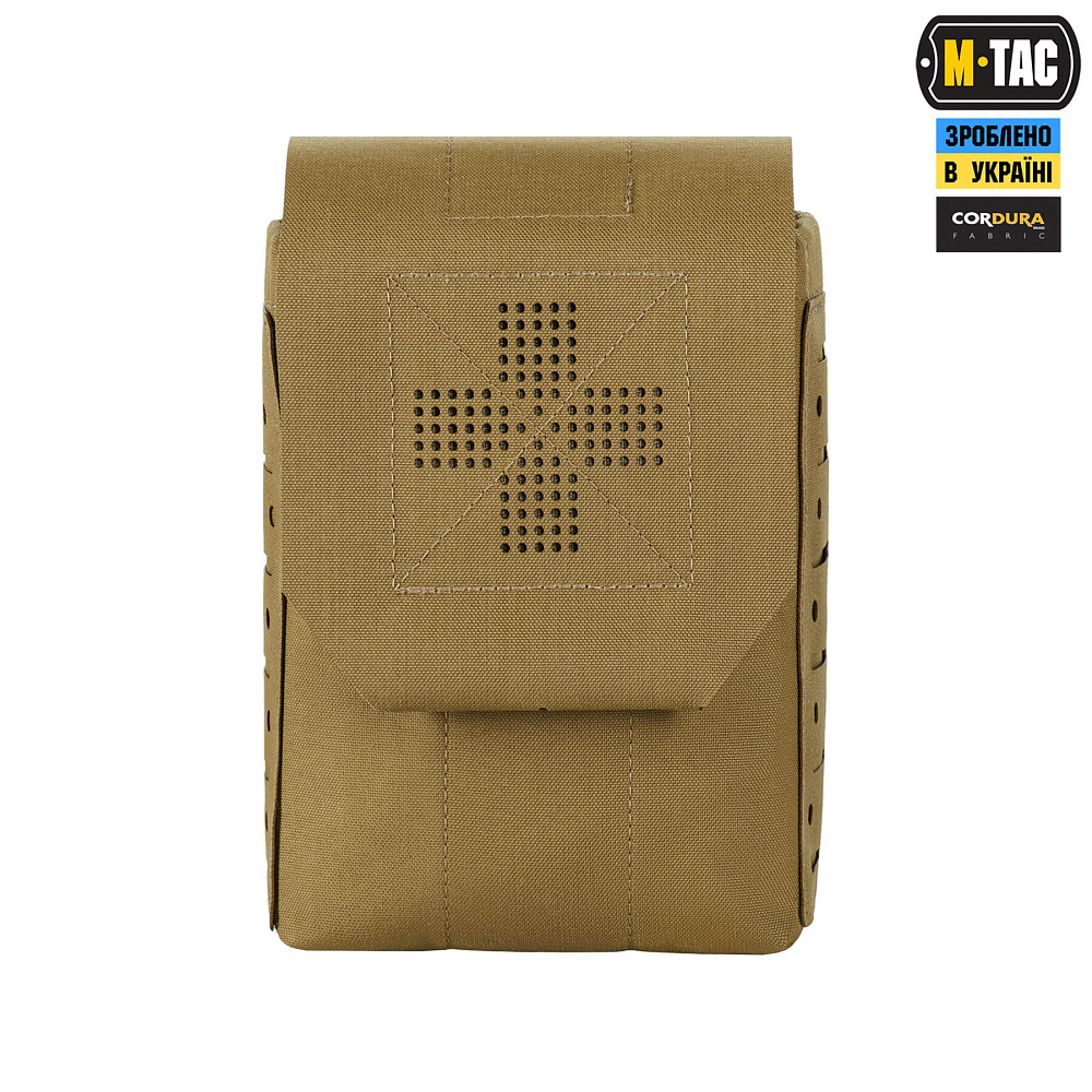 Внешний подсумок и внутренний органайзер изготовлены из Cordura 500D – прочного материала, устойчивого к истиранию и высоким нагрузкам. Внутренние боковые стенки оборудованы нейлоновой стропой, благодаря которой підсумок хорошо держит форму. Дополнительным фиксирующим элементом является стяжка, которая позволяет надежно удерживать аптечку. Подсумок крепится к снаряжению с помощью MOLLE интерфейса, выполненного по технологии Laser Cut.