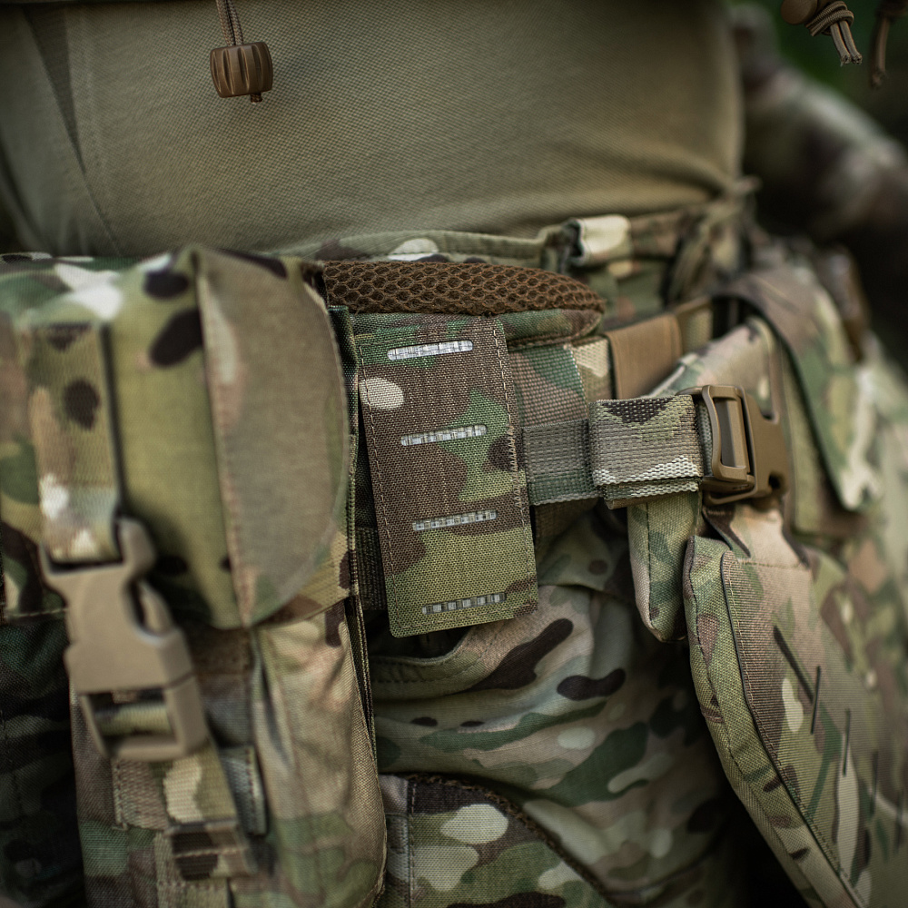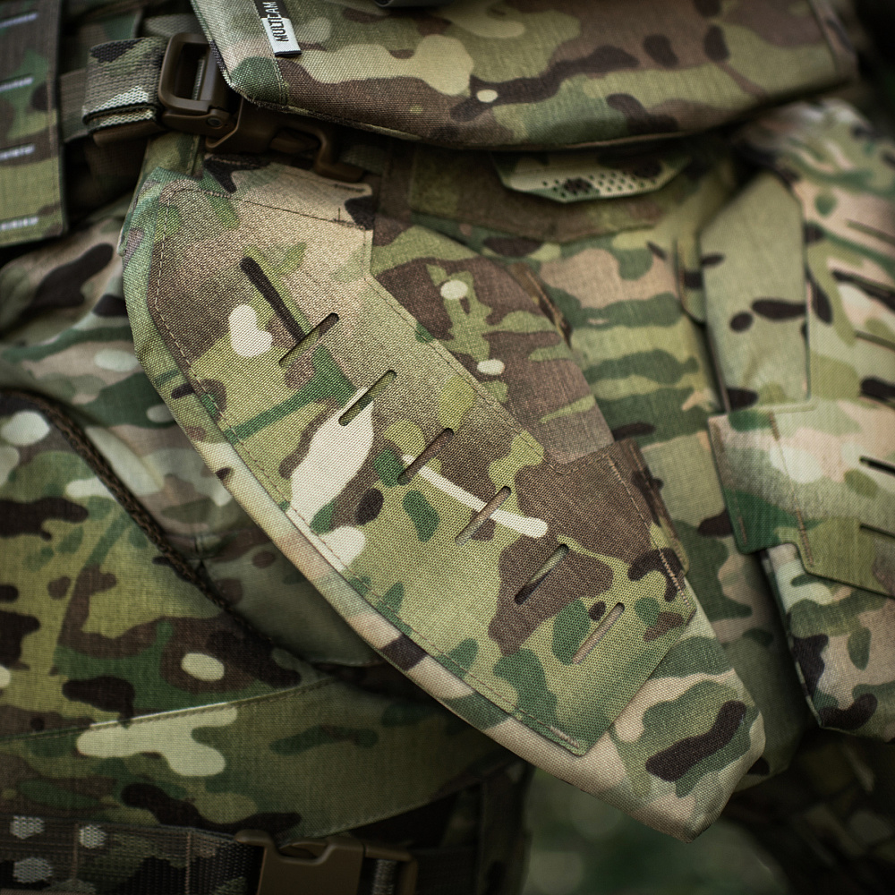 Модуль состоит из центральной и двух боковых панелей, соединенных между собой. Благодаря тому, что боковые элементы модуля являются подвижными, он не будет причинять дискомфорт во время активных физических нагрузок (бег, приседания, ходьба и т.д.). На боковых частях модуля предусмотрена система MOLLE, выполненная по технологии Laser Cut. К ней, при необходимости, можно прикрепить дополнительное, подходящее по размеру, снаряжение.
