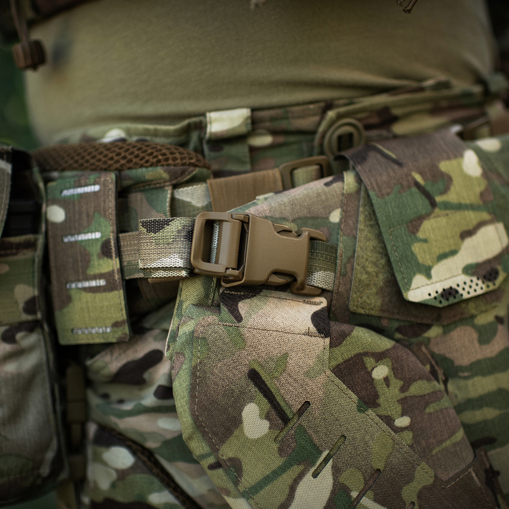 Защита паха крепится к тактическому поясу с помощью креплений, расположенных на боковых частях. Основная часть крепления выполнена из Cordura 500D по технологии Laser Cut, в виде сегмента системы MOLLE. Для прочности, между двумя слоями Cordura, был добавлен термопластичный композит Tegris.