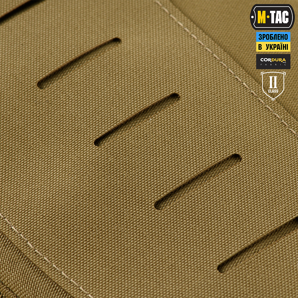 Модуль состоит из центральной и двух боковых панелей, соединенных между собой. Благодаря тому, что боковые элементы модуля являются подвижными, он не будет причинять дискомфорт во время активных физических нагрузок (бег, приседания, ходьба и т.д.). На боковых частях модуля предусмотрена система MOLLE, выполненная по технологии Laser Cut. К ней, при необходимости, можно прикрепить дополнительное, подходящее по размеру, снаряжение.