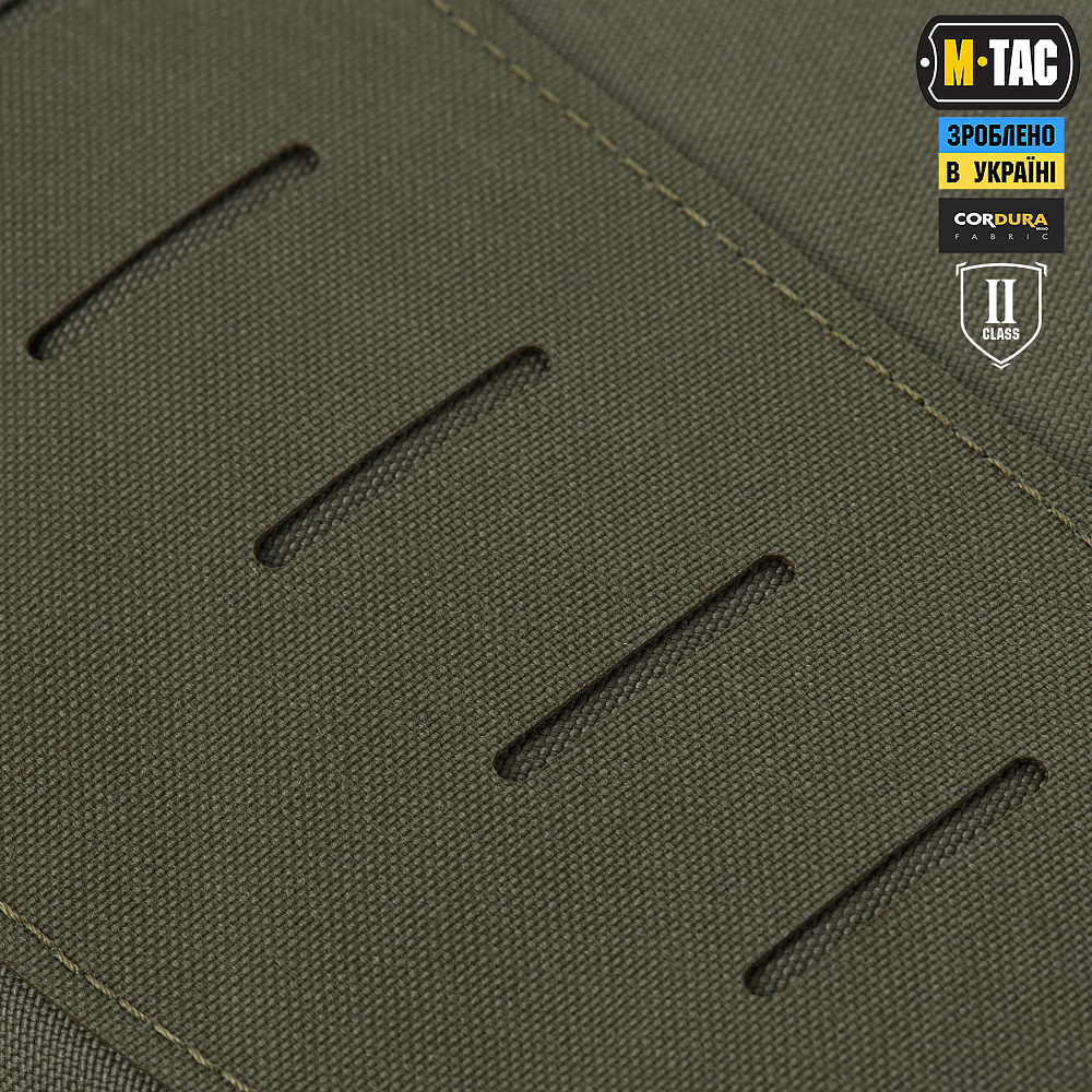 Модуль состоит из центральной и двух боковых панелей, соединенных между собой. Благодаря тому, что боковые элементы модуля являются подвижными, он не будет причинять дискомфорт во время активных физических нагрузок (бег, приседания, ходьба и т.д.). На боковых частях модуля предусмотрена система MOLLE, выполненная по технологии Laser Cut. К ней, при необходимости, можно прикрепить дополнительное, подходящее по размеру, снаряжение.