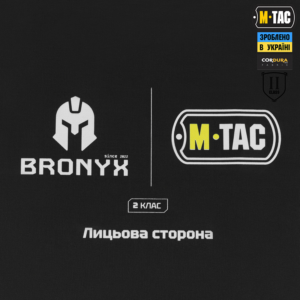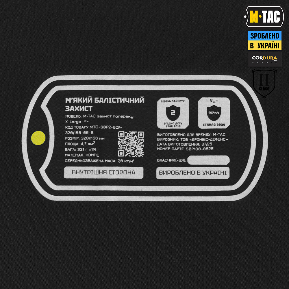 Защита поясницы изготовлена из Cordura 500D - сверхпрочного материала, устойчивого к истиранию и высоким нагрузкам. Комплектуется баллистическим пакетом 2-го класса от украинского производителя профессиональной бронезащиты BRONYX.
