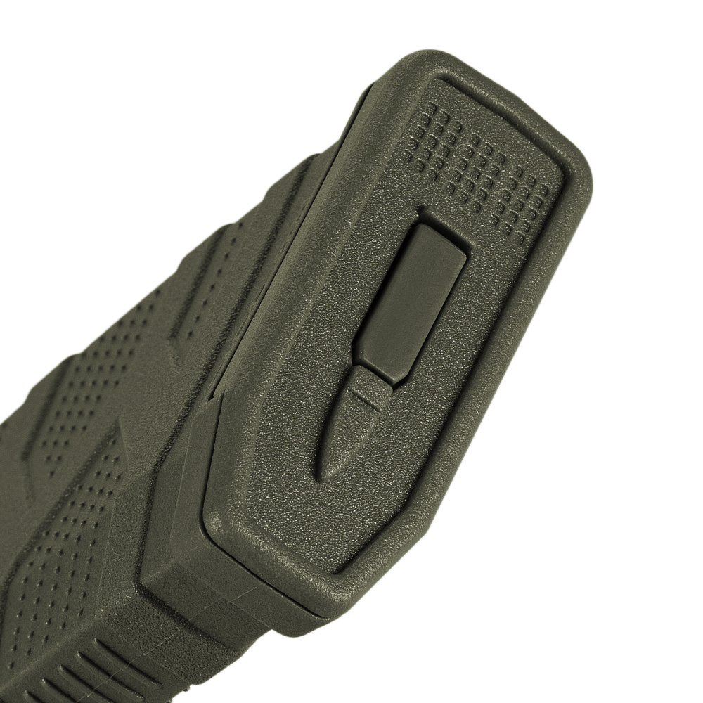 Пятка магазина придает дополнительную прочность при упоре магазина на землю, облегчает его извлечение из подсумка и удержание во время эксплуатации.