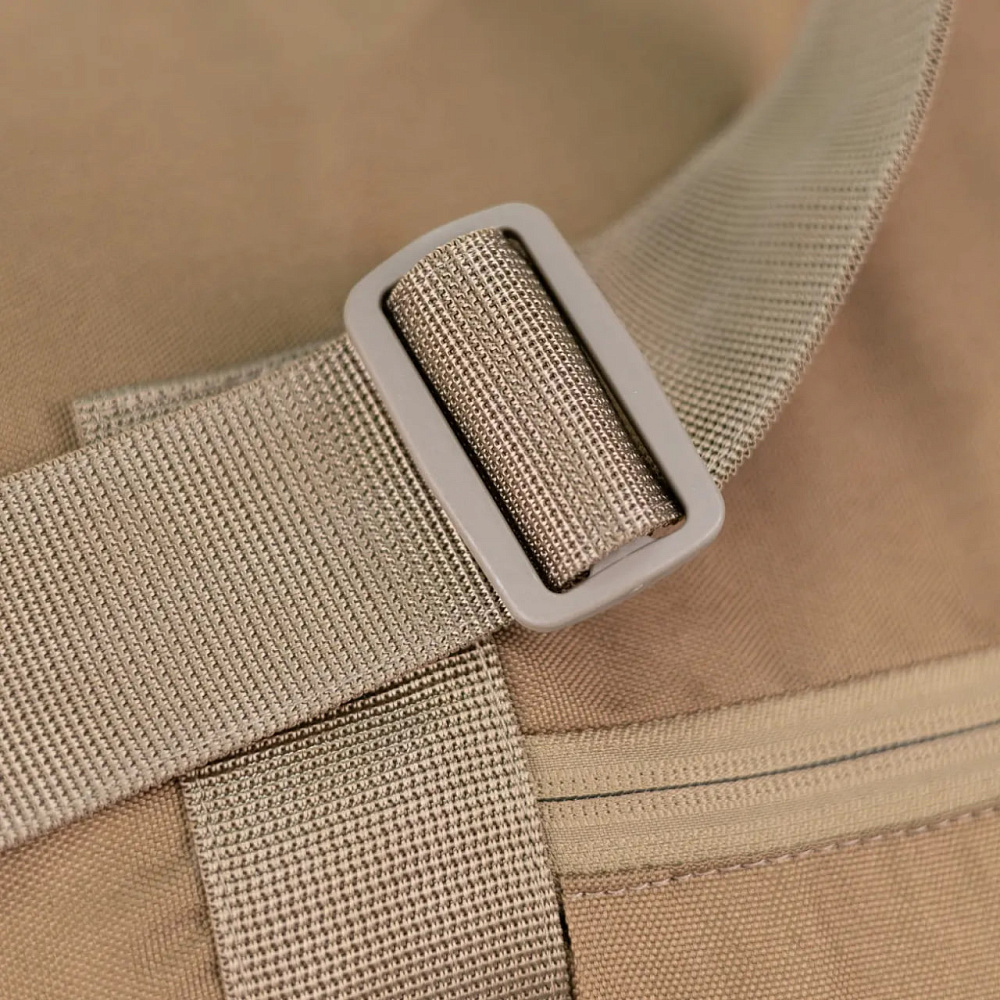 - Широкі (5 см) лямки складаються з двох шарів стропи, завдяки чому здатні витримати велике навантаження. Крім того, вони дають можливість носити баул на спині як рюкзак або в руках як звичайну сумку. За допомогою міцних двощілинних пряжок (6 см) можна відрегулювати їхню довжину до зручного рівня. А демпферні накладки (40×7,5 см), що закріплюються на стропі трьома еластичними фіксаторами, зменшують навантаження на плечі. За потреби їх можна зняти.