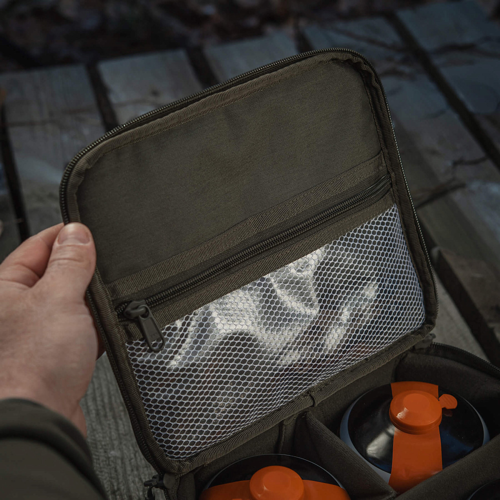 Органайзер має одне основне відділення з адаптивною внутрішньою організацією. Відсіки формуються за допомогою перегородок, що кріпляться до стінок на велкро, дозволяючи змінювати конфігурацію простору залежно від наповнення. Можна збільшувати або зменшувати кількість відсіків, а також коригувати їхній розмір під конкретні предмети, що особливо зручно при зміні задач.