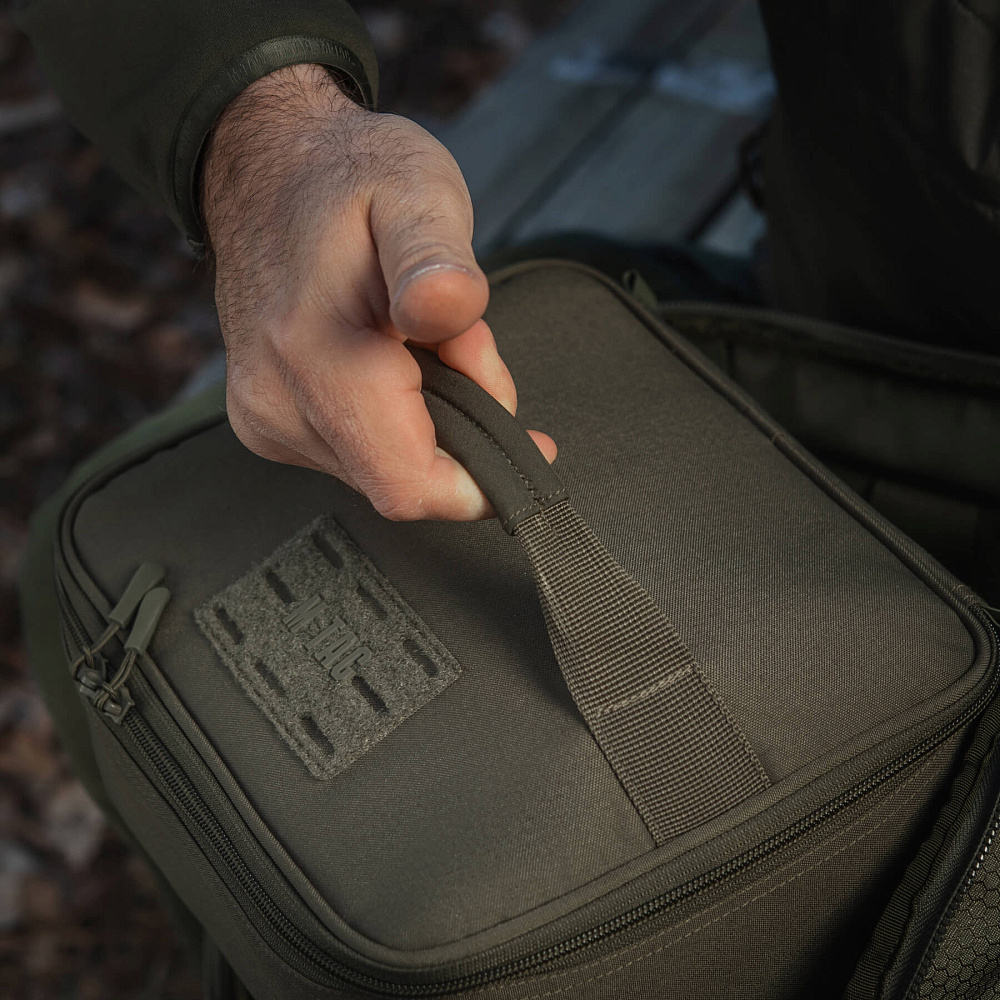 На верхній частині органайзера розташована велкро-панель, призначена для кріплення ідентифікаторів, патчів або маркувальних елементів. Це рішення полегшує ідентифікацію органайзера та дозволяє адаптувати його під конкретні задачі. Тут же передбачена ручка, яка забезпечує зручне перенесення навіть за повного завантаження.