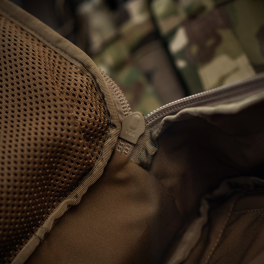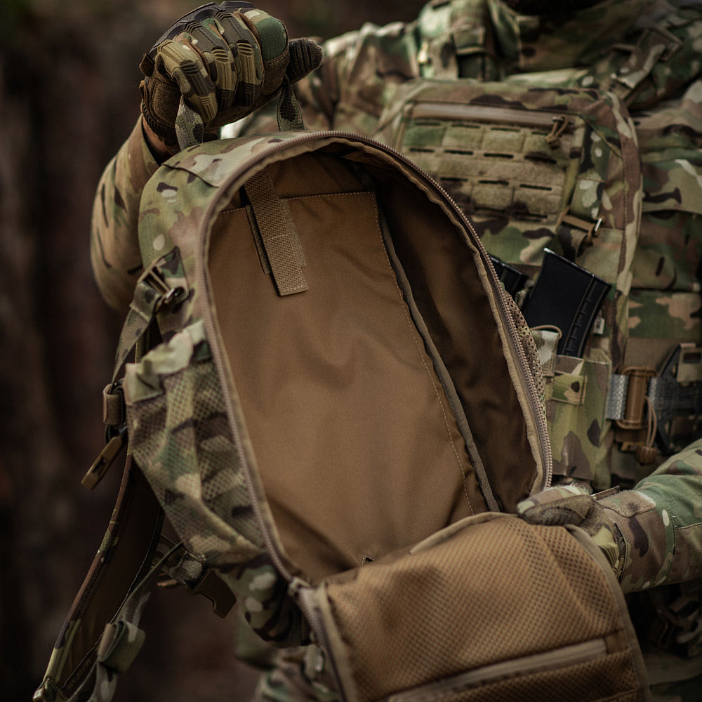 Рюкзак має одне основне відділення, яке відкривається за принципом валізи та дозволить вмістити весь необхідний мінімум речей. Всередині відділення є відсік для питної системи, а зверху – отвір для трубки гідратора. На відкидному клапані рюкзака знаходяться дві сітчасті кишені, які підійдуть для розміщення EDC-набору. Спереду рюкзак оснащений системою Molle Laser Cut, що виготовлена з Cordura Squadron і дозволяє прикріпити додаткове спорядження.