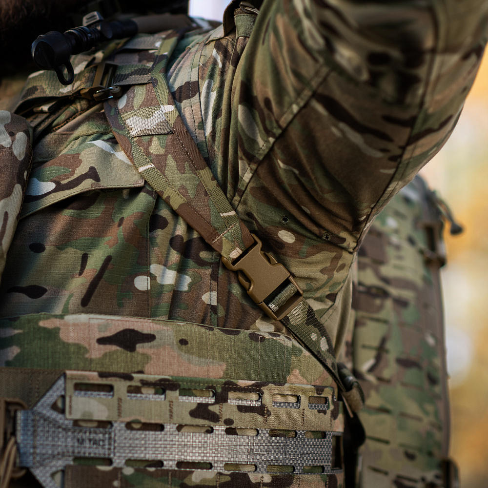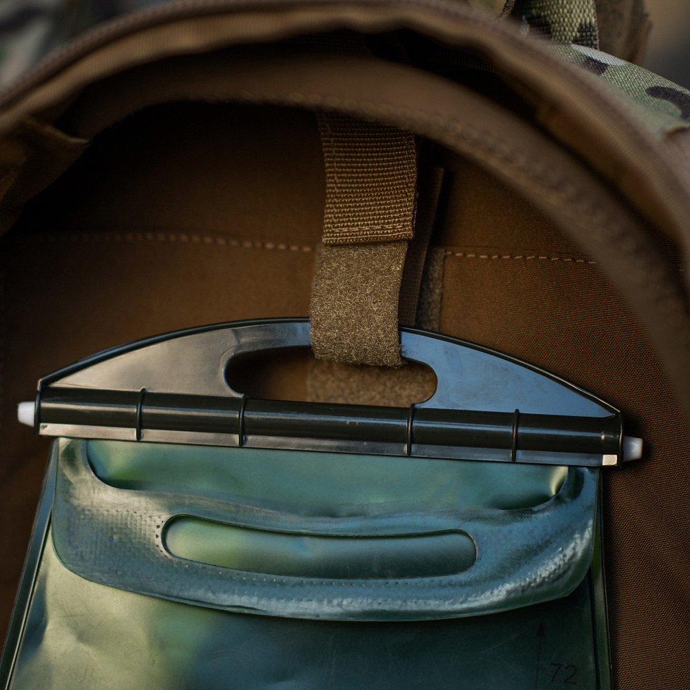 Плечові лямки виконані з міцної тканини Cordura 500D і оснащені прошарком з EVA-піни – легкого полімерного матеріалу, який пом’якшує навантаження на плечі та забезпечує зручність при тривалому носінні. Крім того, лямки обладнані нагрудною стяжкою з фастексом, що запобігає їх зміщенню з плечей, а також додатковими стропами для зручного кріплення трубки питної системи.