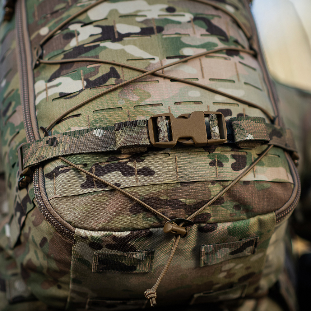На передній панелі рюкзака розміщена система MOLLE Laser Cut, виконана з Cordura Squadron, що забезпечує зручне та надійне кріплення додаткового спорядження або підсумків.