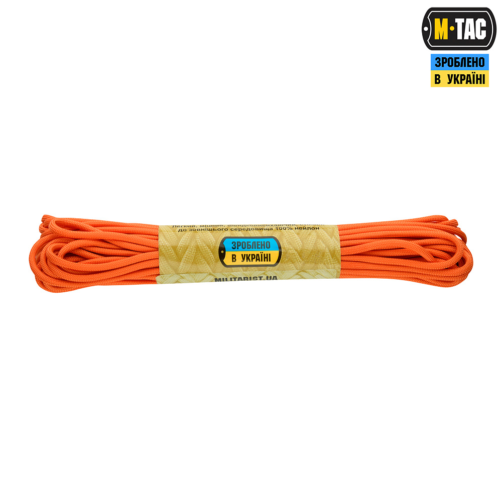 M-Tac паракорд 550 type III - це нейлоновий шнур, що складається з зовнішнього обплетення (велика кількість переплетених волокон) і сердечника (кілька нейлонових ниток, переплетених між собою), що забезпечують його міцність і невелику вагу.