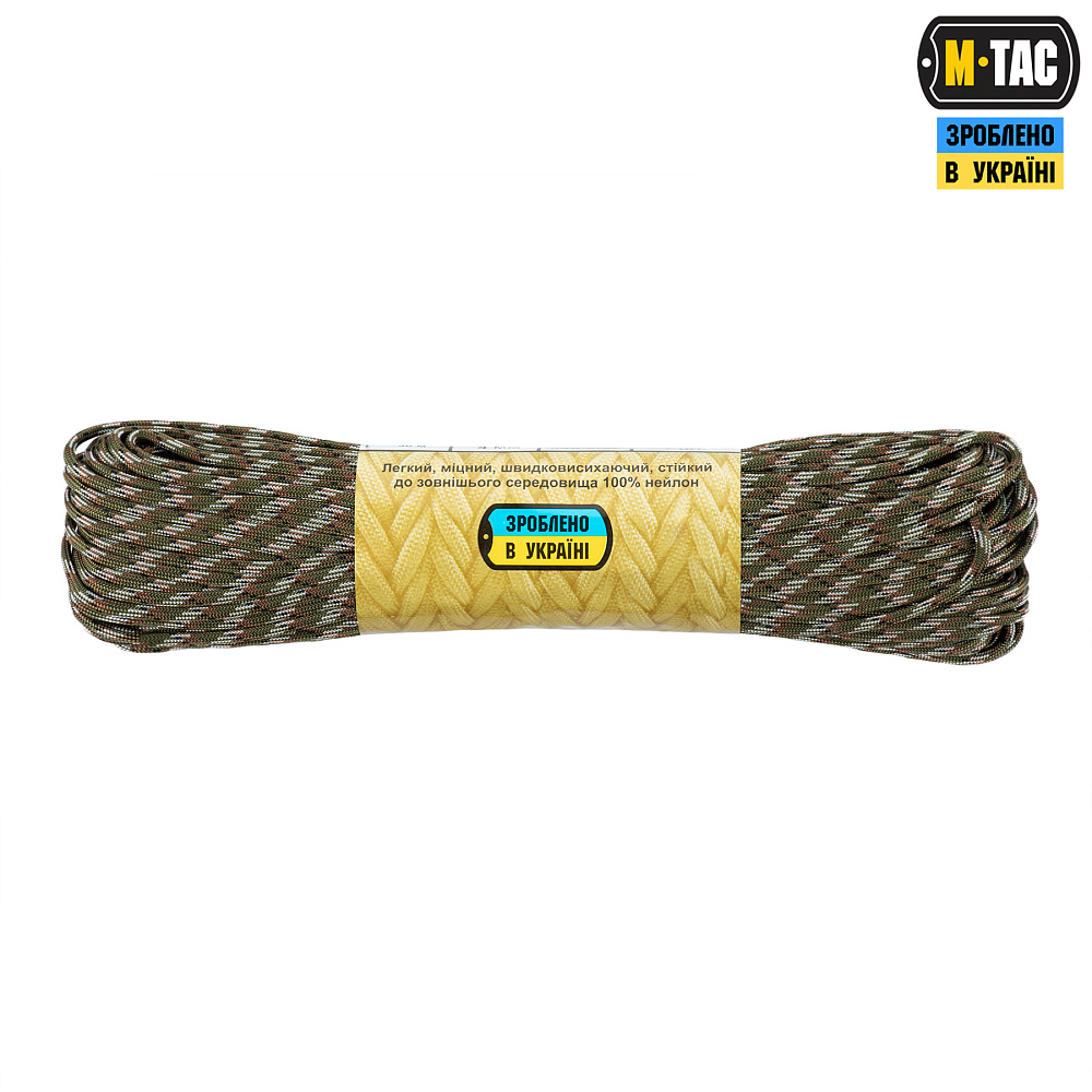 M-TAC ПАРАКОРД 550 TYPE III- шнур, що складається із зовнішнього обплетення (велика кількість переплетених волокон) і сердечника (кілька нейлонових ниток, з'єднаних між собою). Це забезпечує його міцність та невелику вагу.