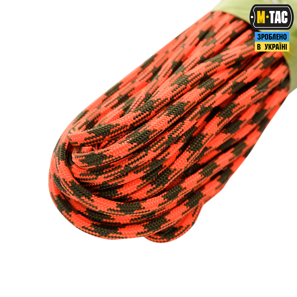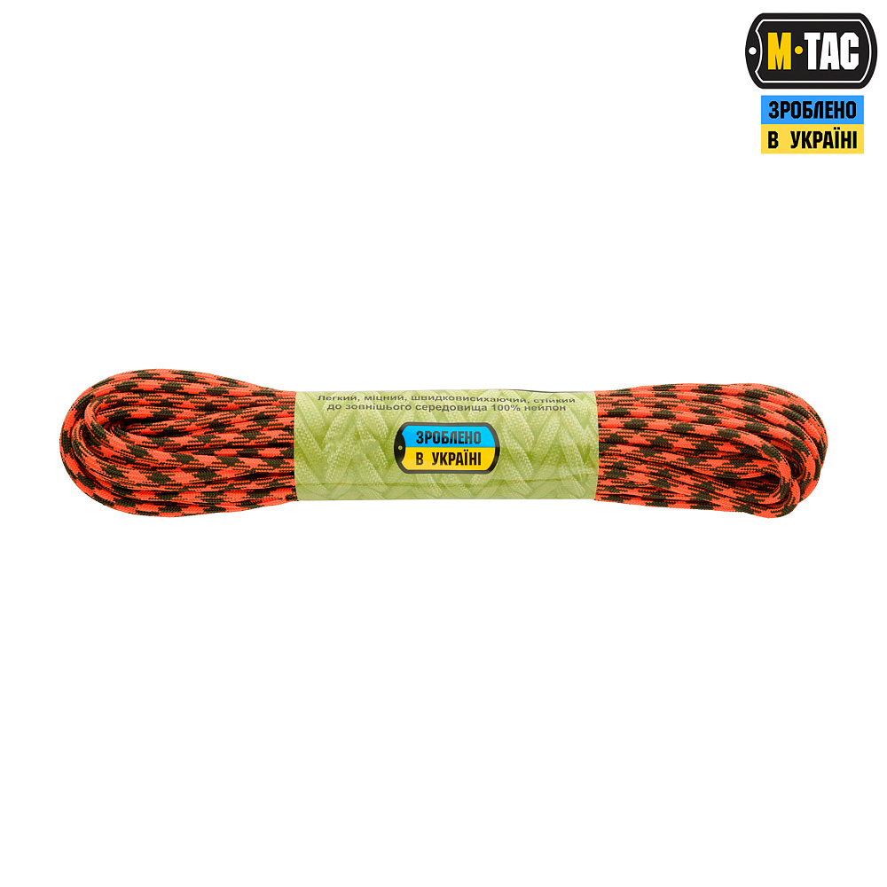M-Tac паракорд Survival - це нейлоновий шнур, що складається з зовнішнього обплетення (велика кількість переплетених волокон) і сердечника (кілька нейлонових ниток, переплетених між собою), що забезпечують його міцність і невелику вагу. Начинка моделі SURVIVAL це 7 поліамідних ниток (550-paracord) а також джут і плетений рибальський шнур.