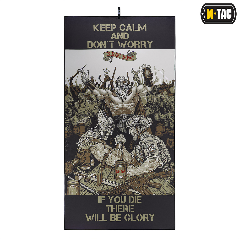 Принт полотенца изображает сюжет, в котором украинский защитник попадает в Вальгаллу. Там, с одним из древних воинов, он сражается в дуэли по армрестлингу, а время до начала поединка для них отсчитывает сам Один. Надписи на полотенце «KEEP CALM AND DON'T WORRY» и «IF YOU DIE THERE WILL BE GLORY» — символизируют славу для каждого защитника родной земли, даже после смерти.