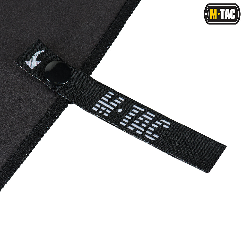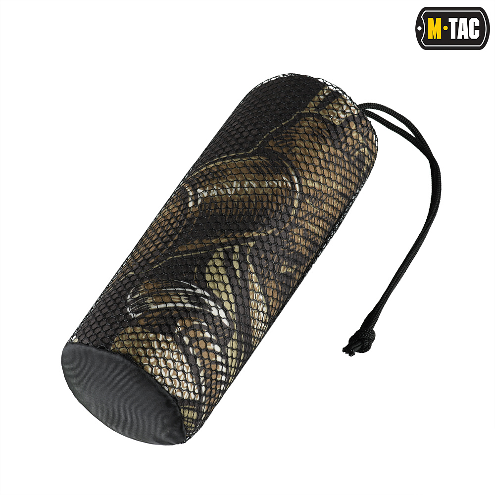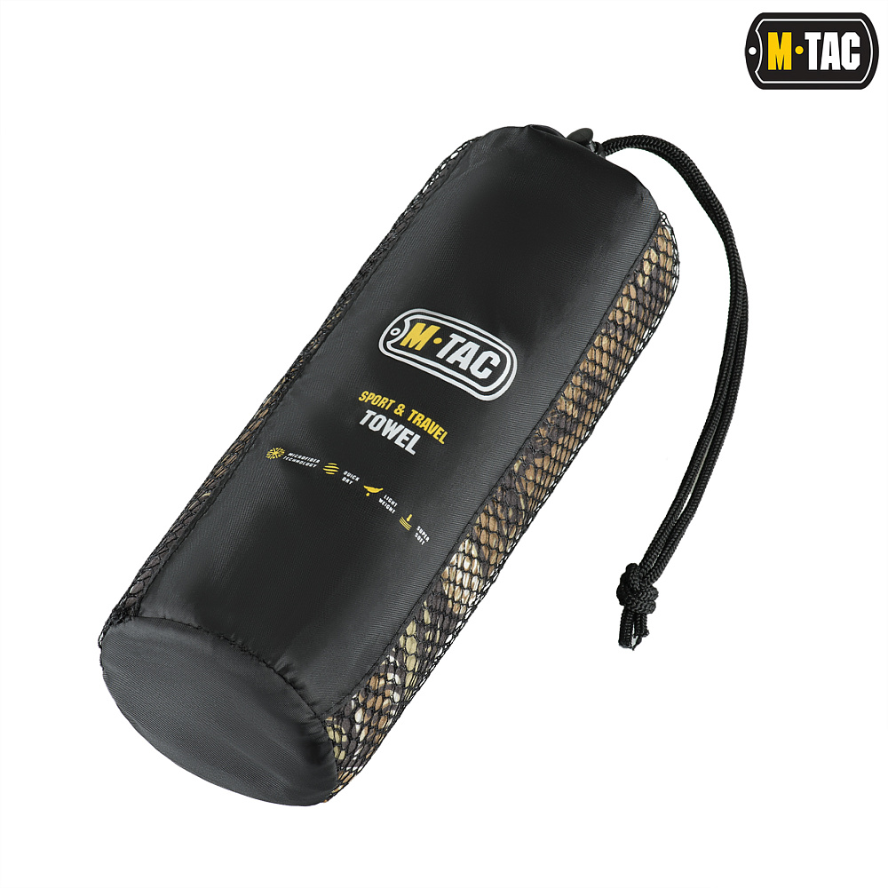 Сбоку на полотенце расположена бирка М-Тас с рекомендациями по уходу, которая также может выполнять роль петли для подвешивания. В комплекте с полотенцем идет сетчатый чехол, закрывающийся с помощью шнурка с фиксатором.