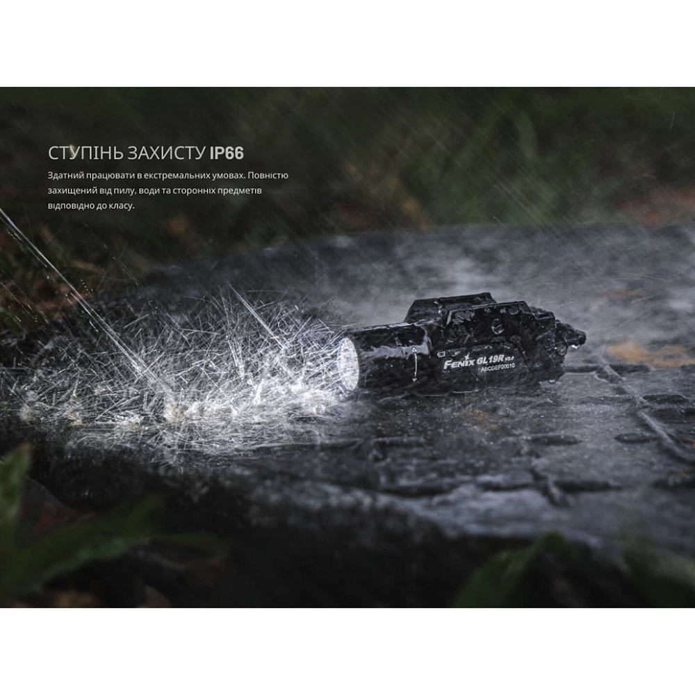 Модель ліхтаря Fenix GL19R являє собою потужний тактичний прилад. Максимальна яскравість досягає 1200 люменів, а далекобійність променя – 210 метрів. Особливості моделі: краща видимість і можливості прицілювання при стрільбі. Ліхтар надзвичайно компактний, при цьому, дає відмінну яскравість освітлення. Його можна швидко прикріпити як до універсальної направляючої, так і до планки Пікатінні за допомогою запатентованого важеля QD.