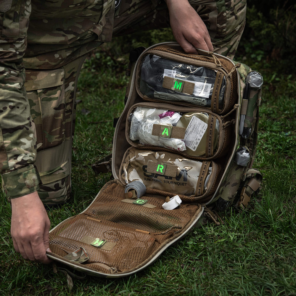 Нашивки розроблені спеціально для використання у M-Tac наплічнику бойового медика. Вони кріпляться до велкро-панелей відсіків основного відділення, позначаючи відповідний етап алгоритму MARCH. Така система спрощує організацію простору та пришвидшує пошук необхідного медичного устаткування.