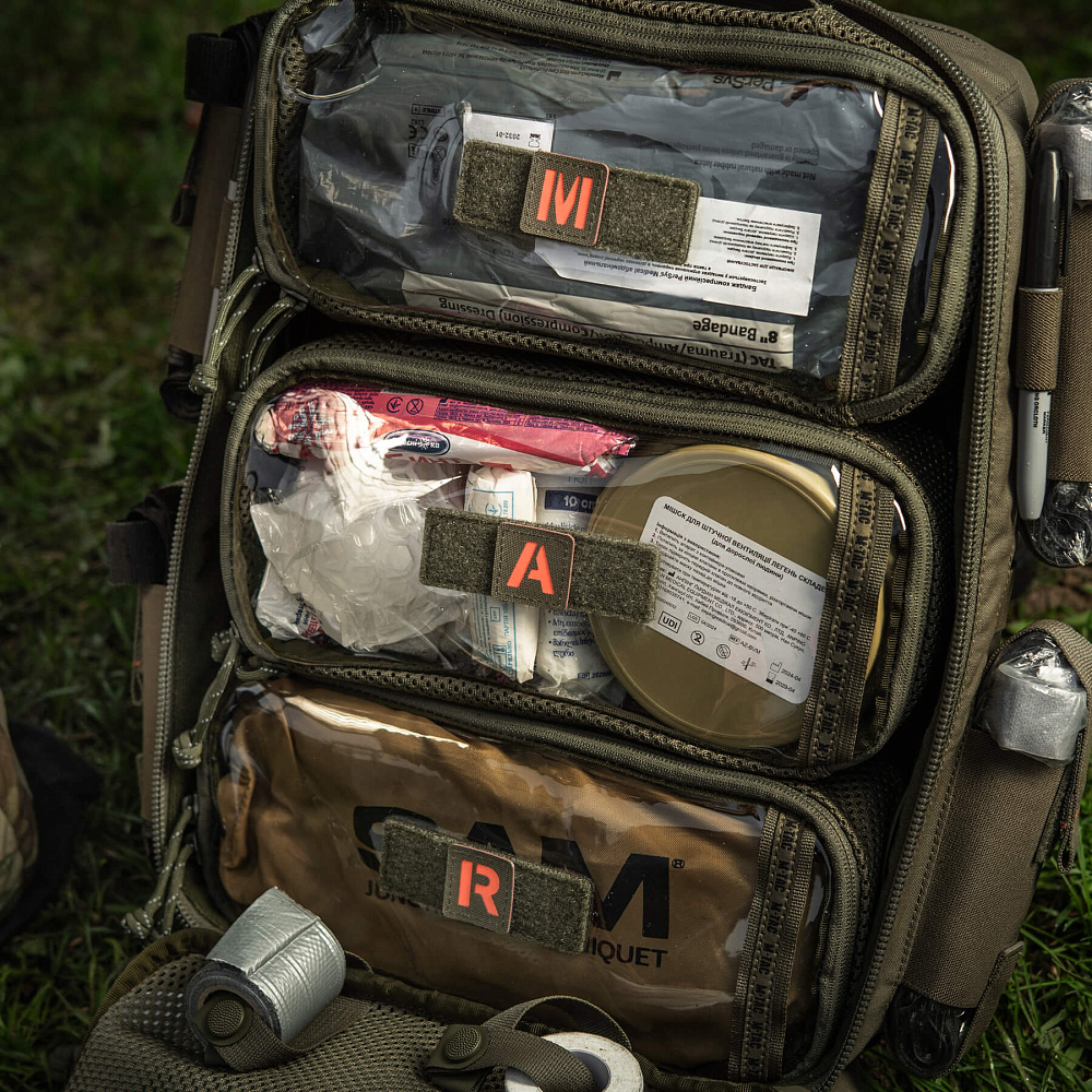 Нашивки розроблені спеціально для використання у M-Tac наплічнику бойового медика. Вони кріпляться до велкро-панелей відсіків основного відділення, позначаючи відповідний етап алгоритму MARCH. Така система спрощує організацію простору та пришвидшує пошук необхідного медичного устаткування.