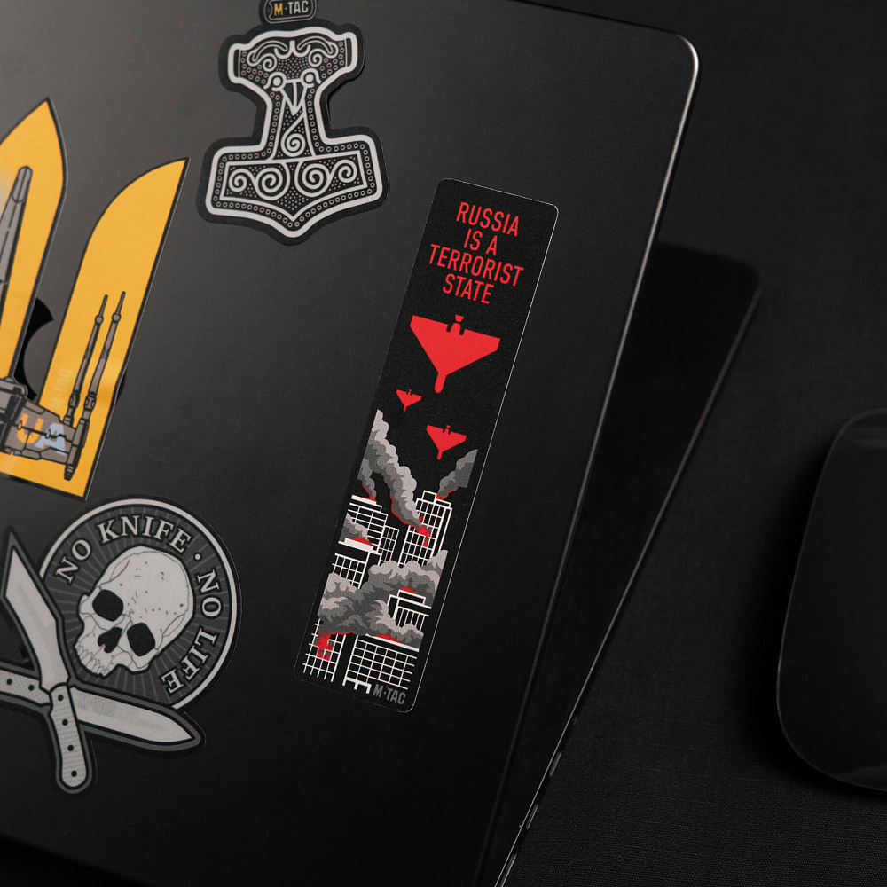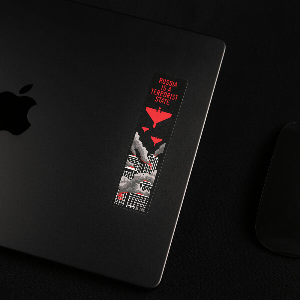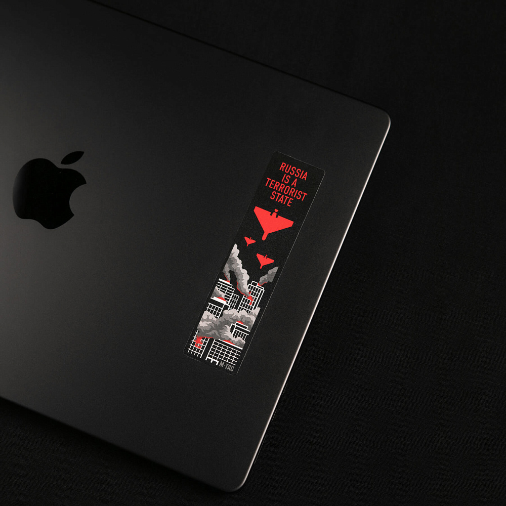 M-TAC НАКЛЕЙКА RUSSIA IS A TERRORIST STATE – маніфест про жорстокість ворога, його байдужість до правил ведення війни та будь-яких законів гуманності.
